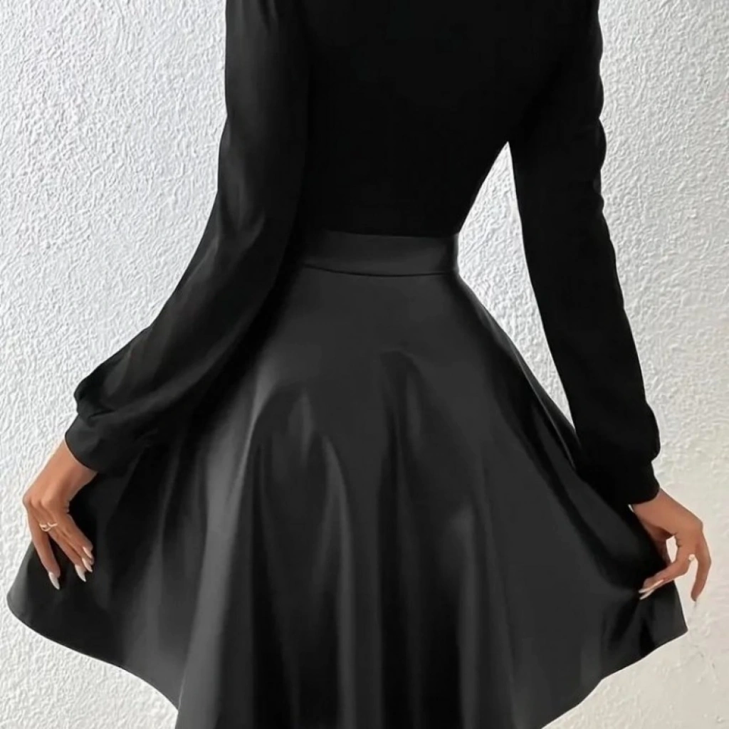 Kadın Uzun Kollu Kare Yaka üst Viskon Alt Deri Mini Elbise