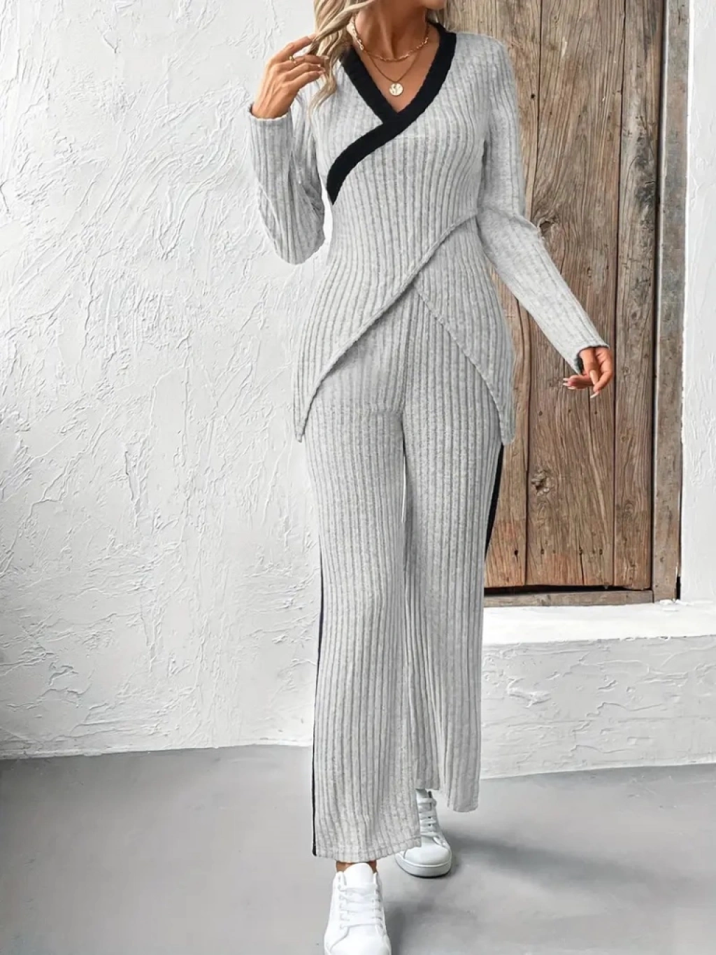 Kadın Uzun Kollu V Yakalı çapraz Detaylı şardonlu Kaşkorse Bluz Ve Pantolon Ikili Takım