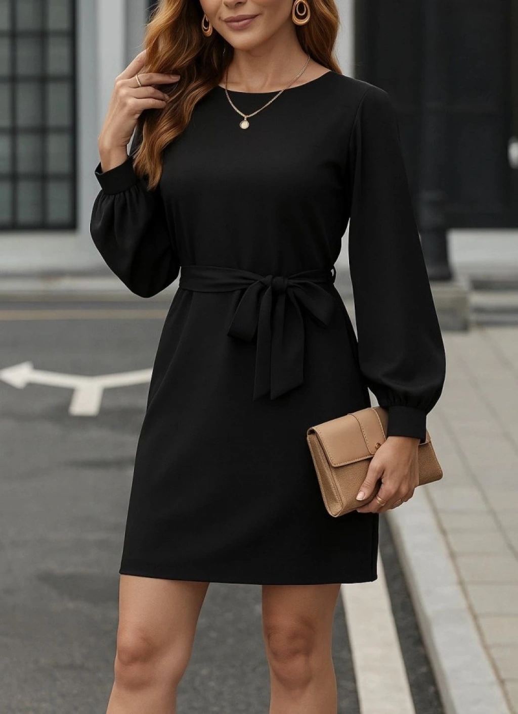 Kadın Uzun Kollu Kayık Yaka Belden Kuşaklı Kısa Ithal Krep Elbise