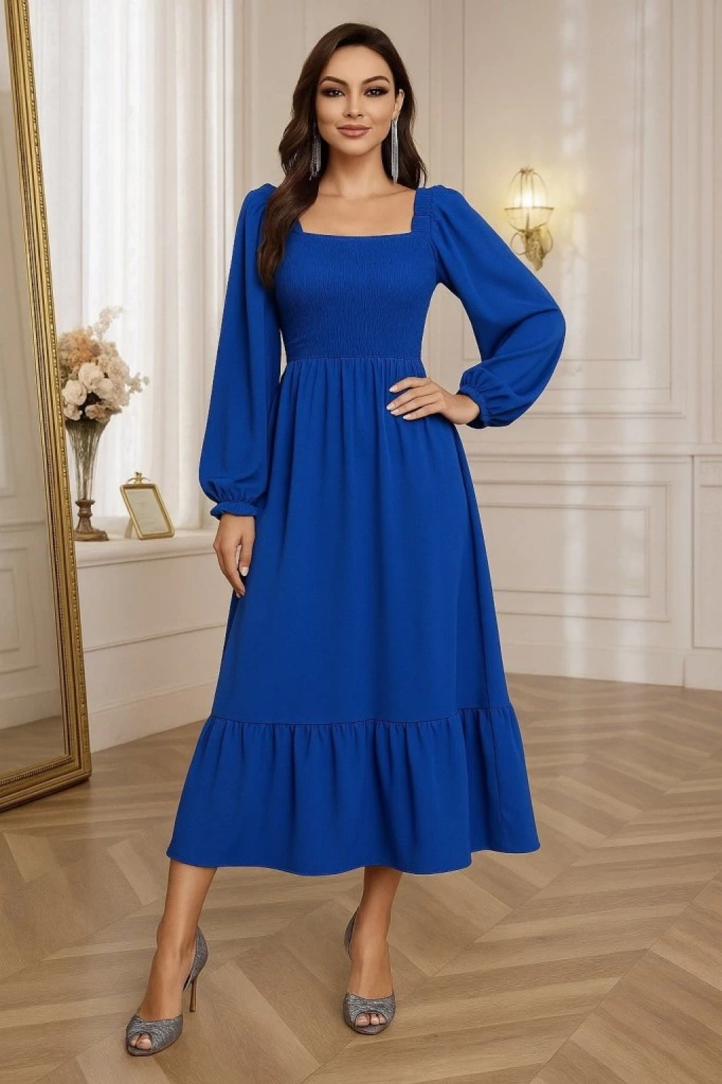 Kadın Uzun Kollu Kare Yakalı Gipeli Uzun Trikoton Elbise