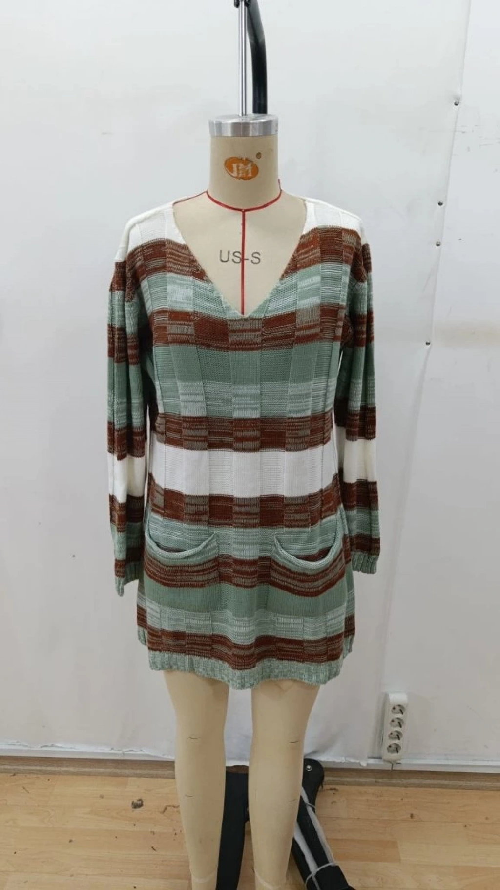 Kadın Uzun Kollu V Yakalı çizgili çok Renkli Triko Mini Elbise