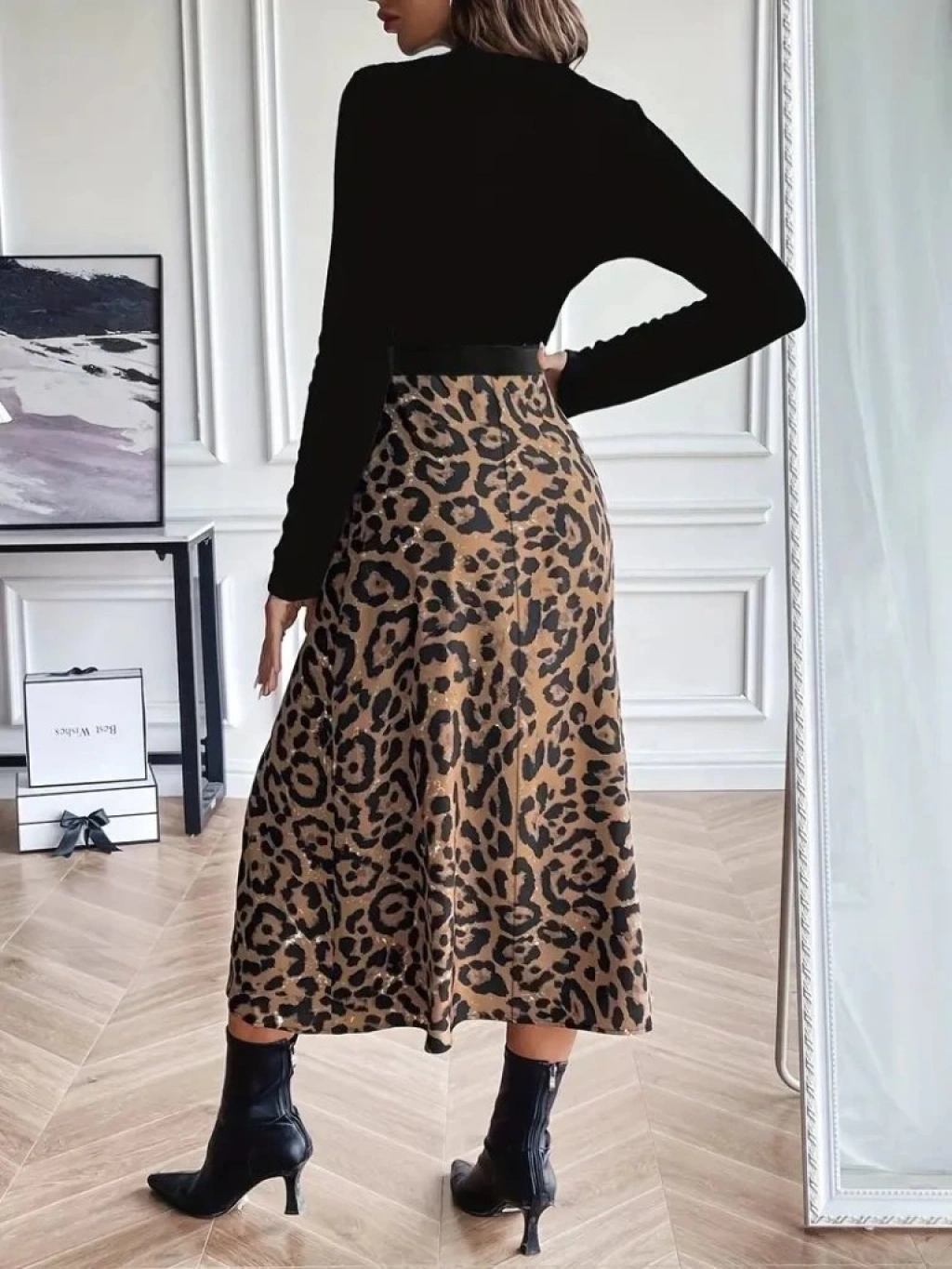 Kadın Uzun Kollu Bisiklet Yaka Ithal Krep Bluz Alt Desenli Modal Midi Elbise