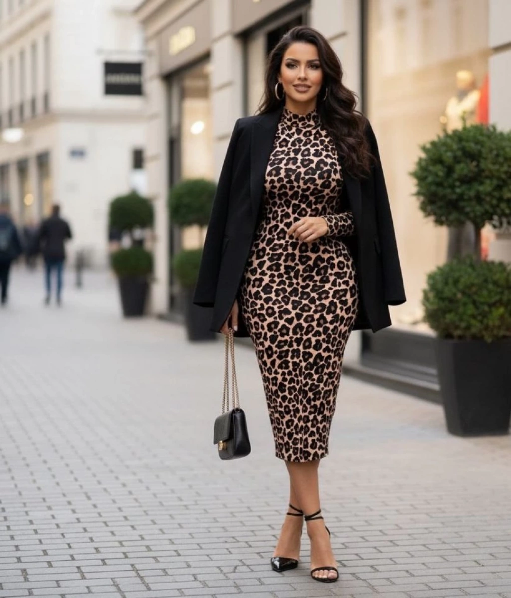 Kadın Uzun Kollu Balıkçı Yaka Leopar Desenli Midi Boy Elbise