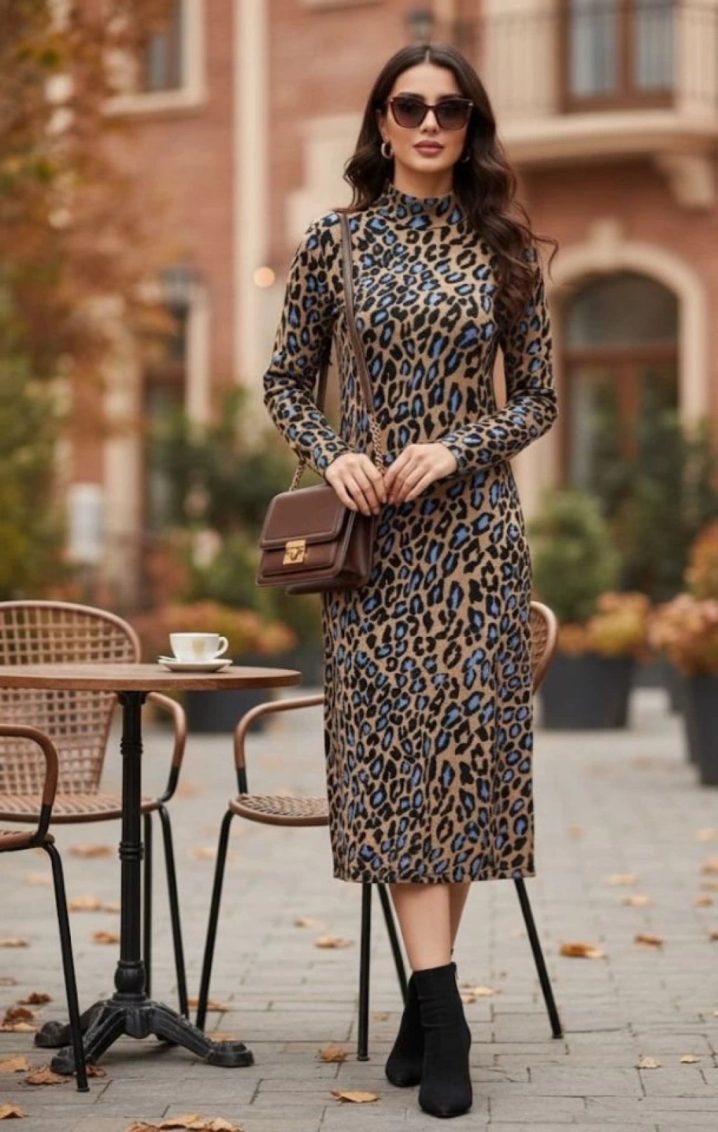 Kadın Uzun Kollu Balıkçı Yaka Leopar Desenli Midi Boy Elbise
