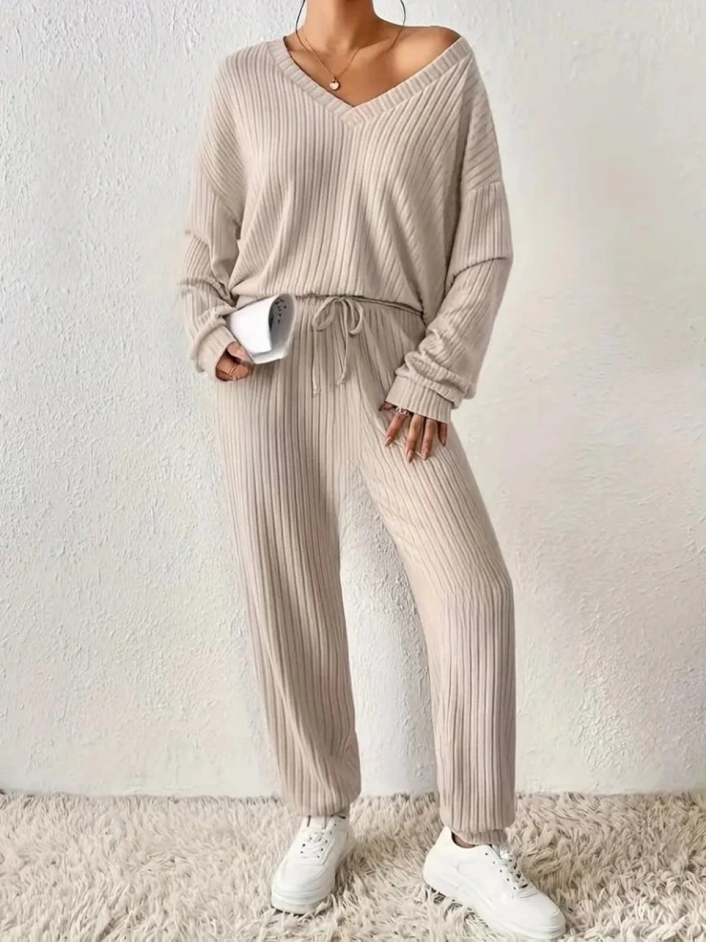Kadın Uzun Kollu V Yakalı Kaşkorse Bluz Ve Pantolon Ikili Takım