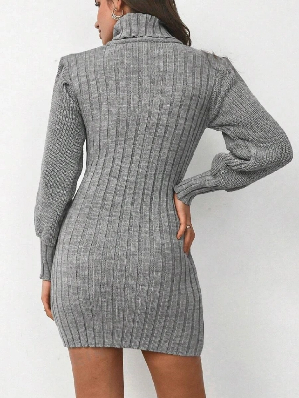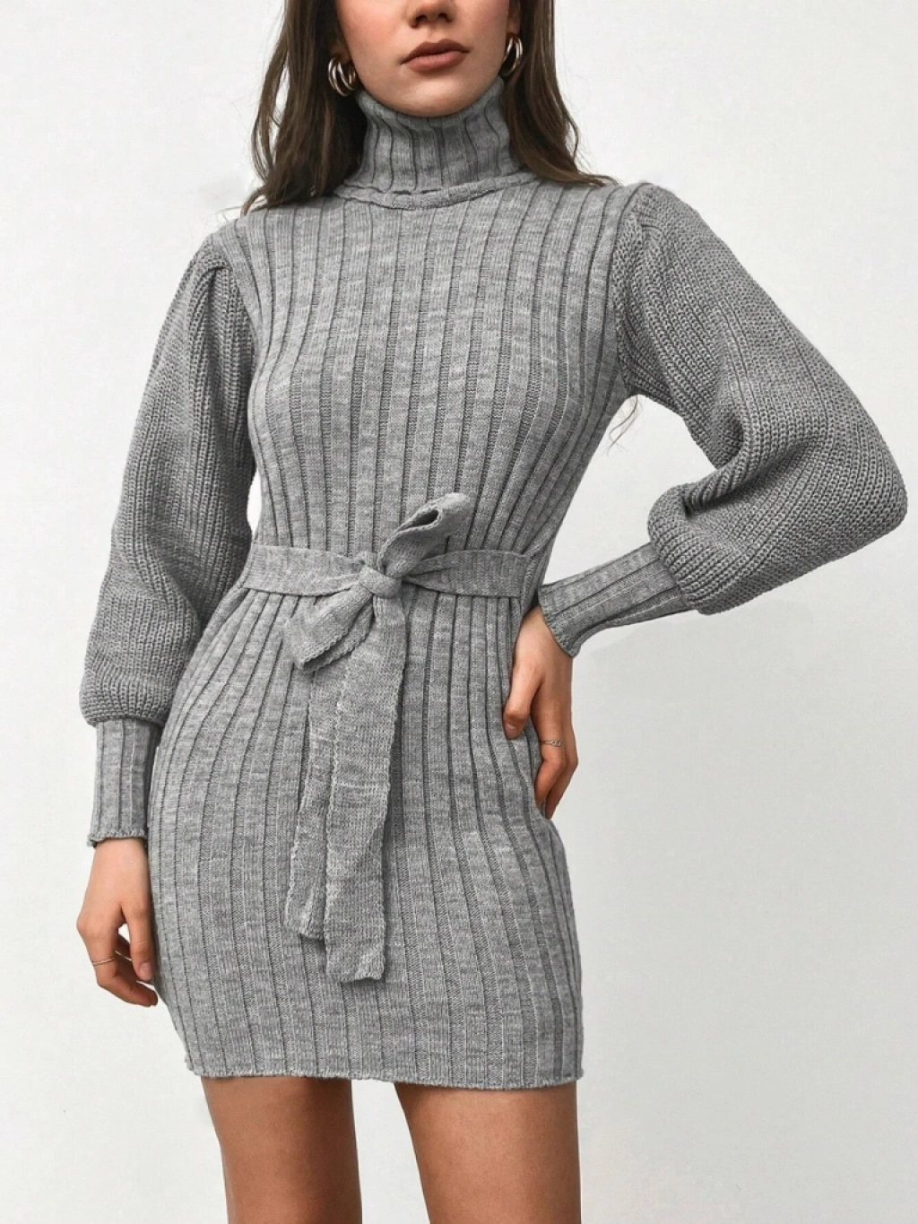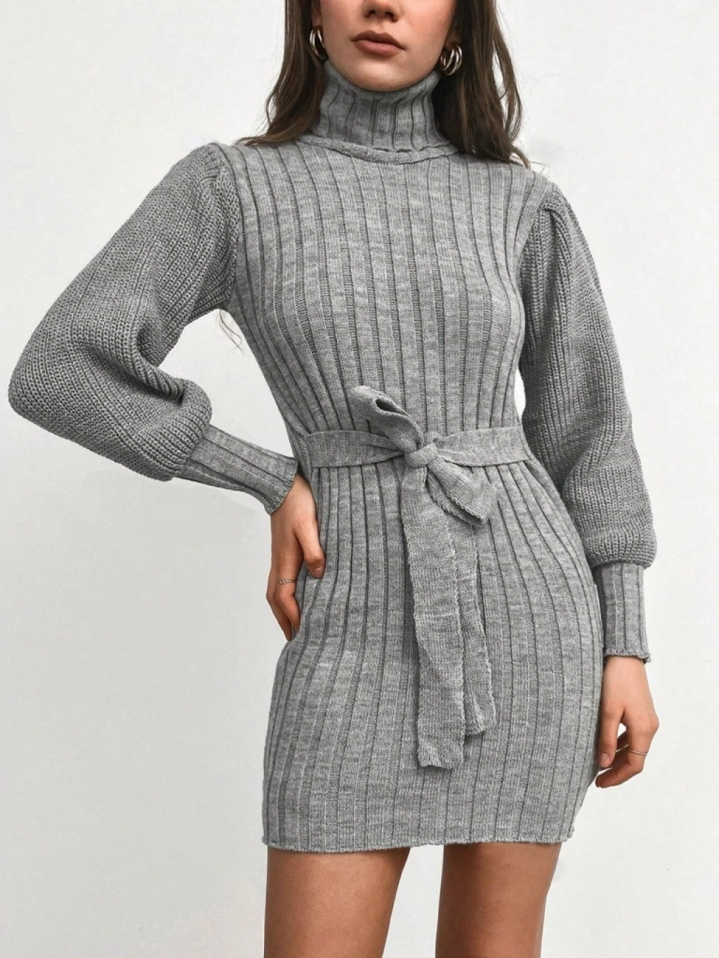 Kadın Uzun Kollu Balıkçı Yaka Beli Kuşaklı Mini Triko Elbise