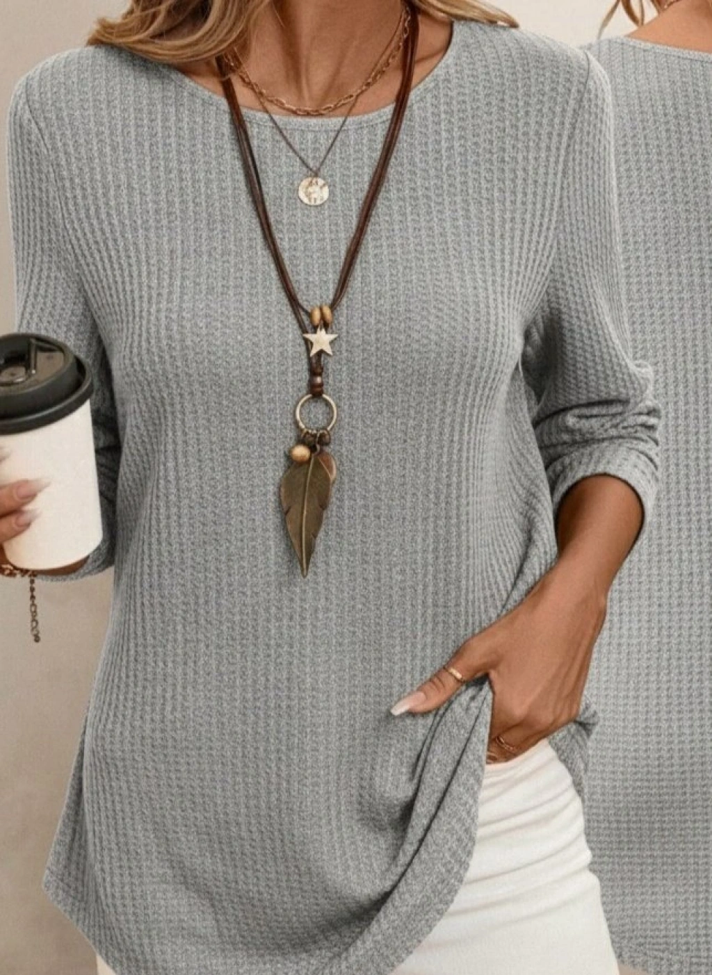 Kadın Uzun Kollu Yuvarlak Yaka Arkadan Düğmeli Waffle Bluz