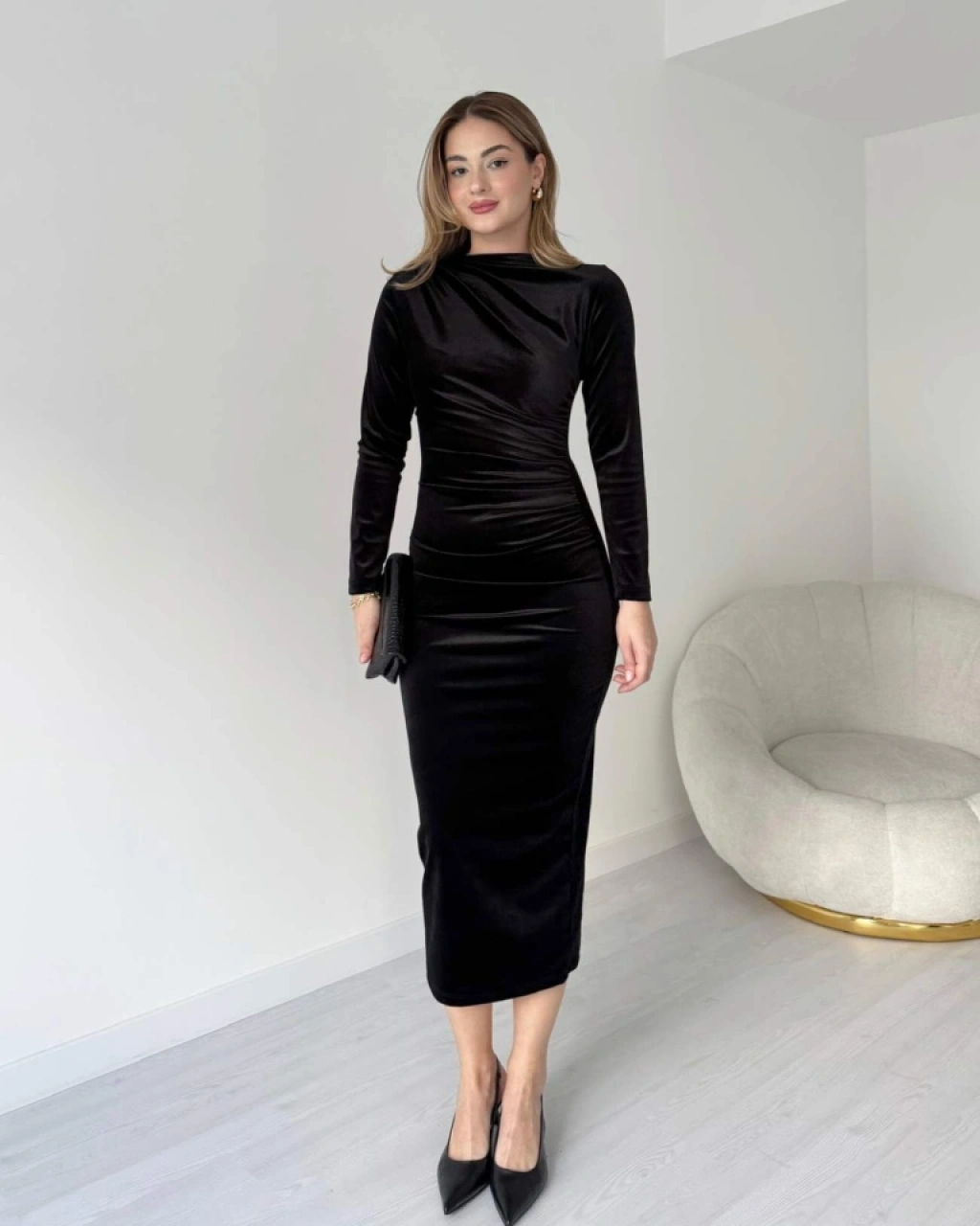 Siyah Uzun Kollu Büzgü Detay Kadife Kumaş Midi Boy Elbise
