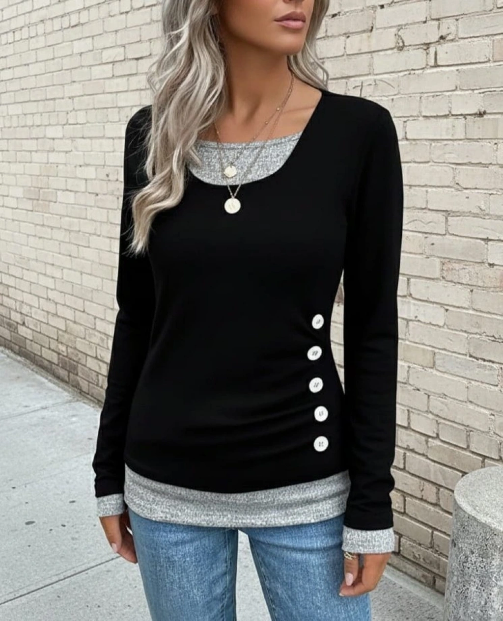 Kadın Uzun Kollu Yuvarlak Yaka Blok Renkli Yandan Düğmeli Viskon Bluz