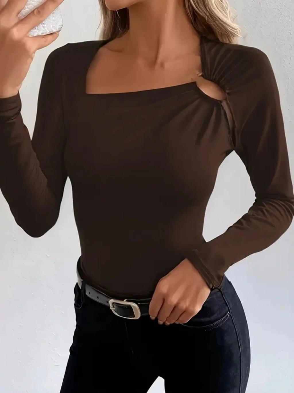Kadın Uzun Kollu Yakadan Halka Detaylı Viskon Bluz