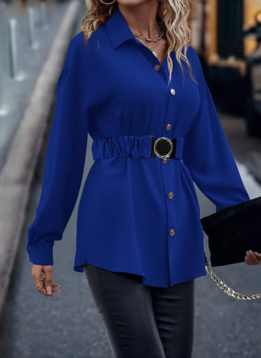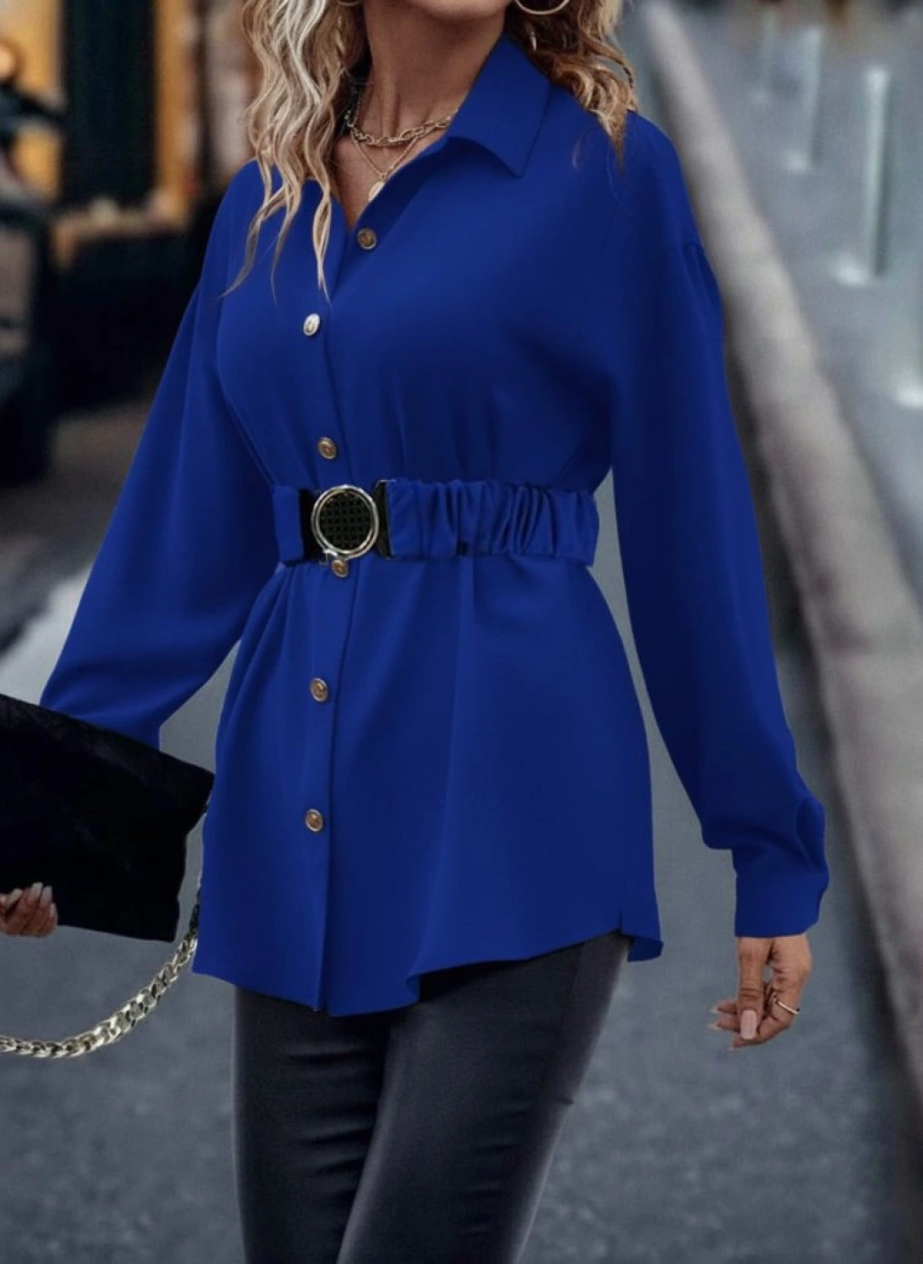 Kadın Uzun Kollu Yakalı önden Düğmeli Belden Kemerli Ithal Krep Bluz