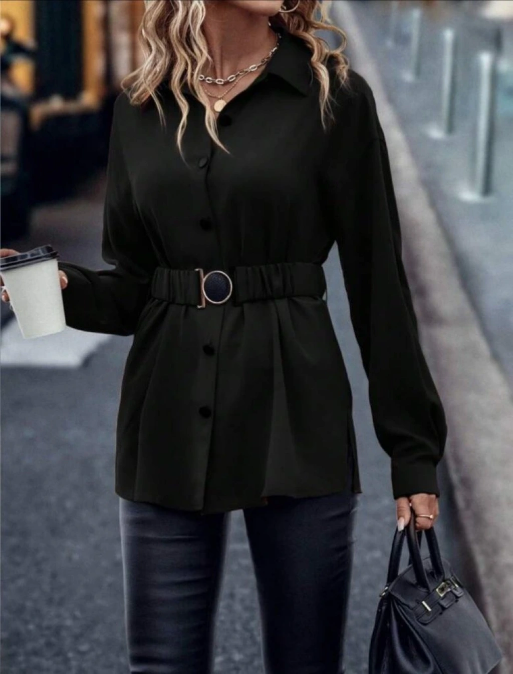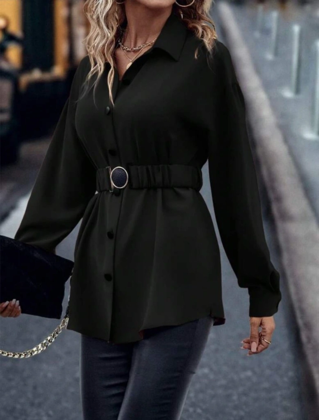 Kadın Uzun Kollu Yakalı önden Düğmeli Belden Kemerli Ithal Krep Bluz