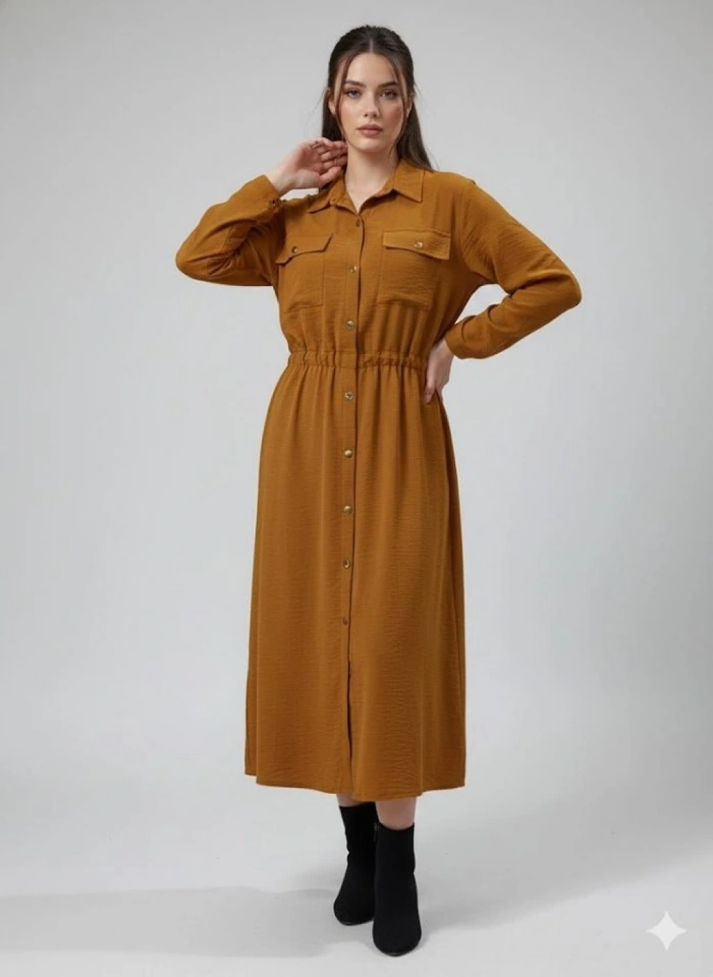 Kadın Uzun Kollu Beli Lastik Ve Düğme Detay Gömlek Elbise