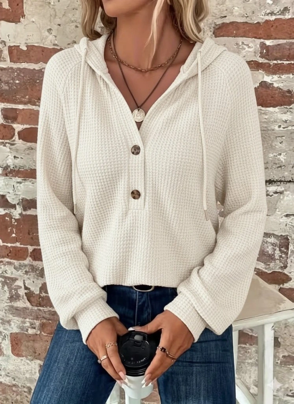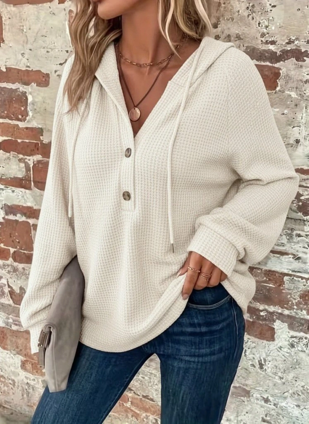 Kadın Uzun Kollu Kapşonlu önü Düğmeli Ve Bağcıklı Waffle Bluz