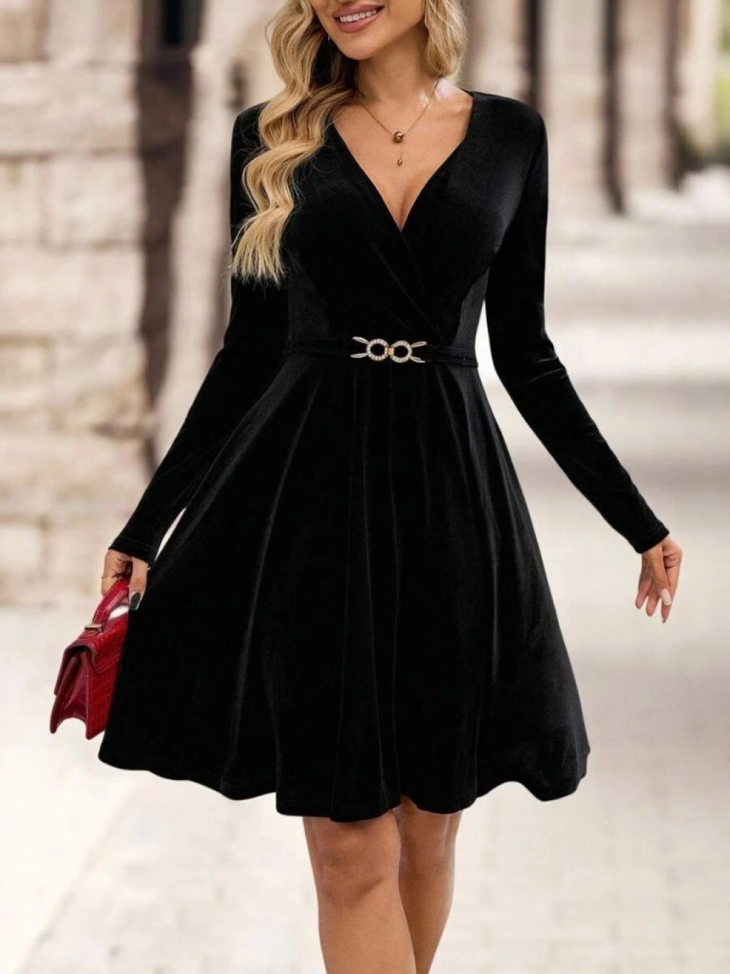 Kadın Uzun Kollu Kruvaze Yakalı Toka Detaylı Mini Kadife Elbise