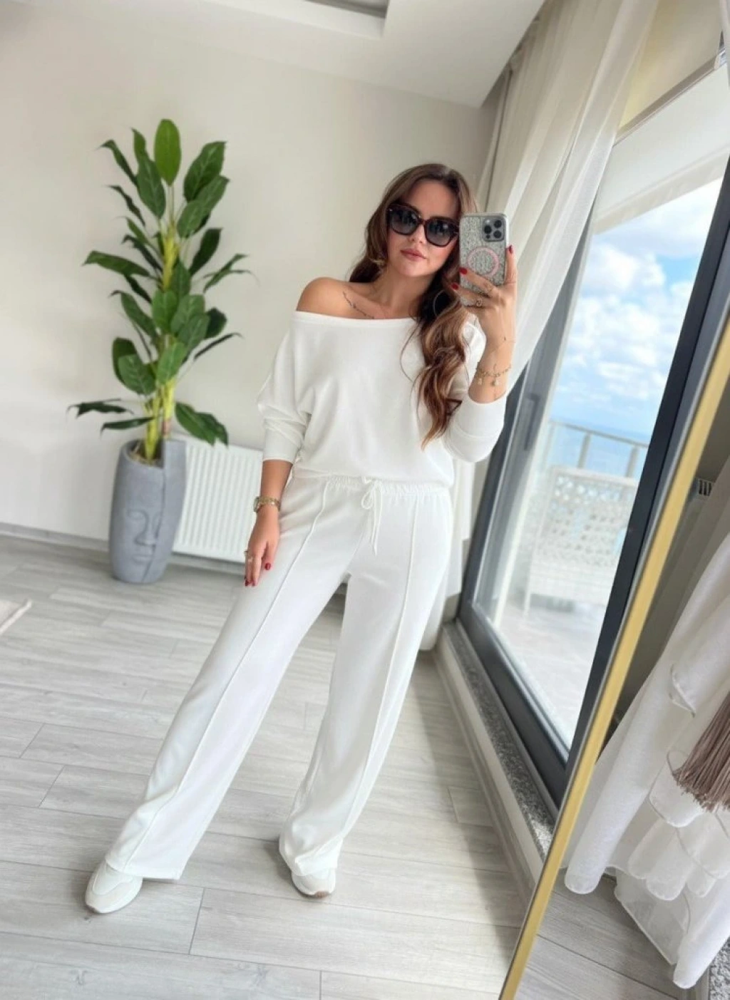 Kadın Uzun Kollu Tek Omuzdan Açık Dalgıç Bluz Ve Pantolon Ikili Takım