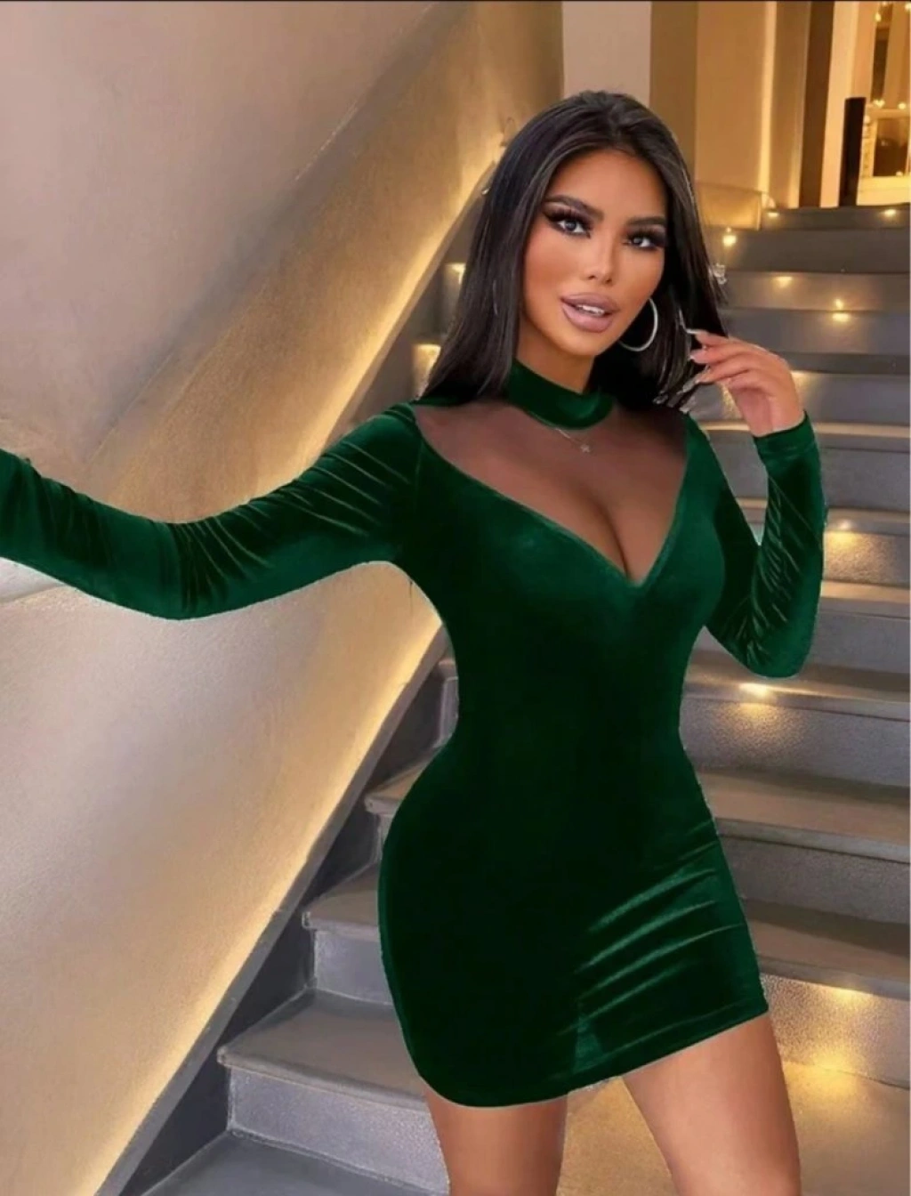 Kadın Uzun Kollu Balıkçı Yaka Tül Detaylı Mini Kadife Elbise