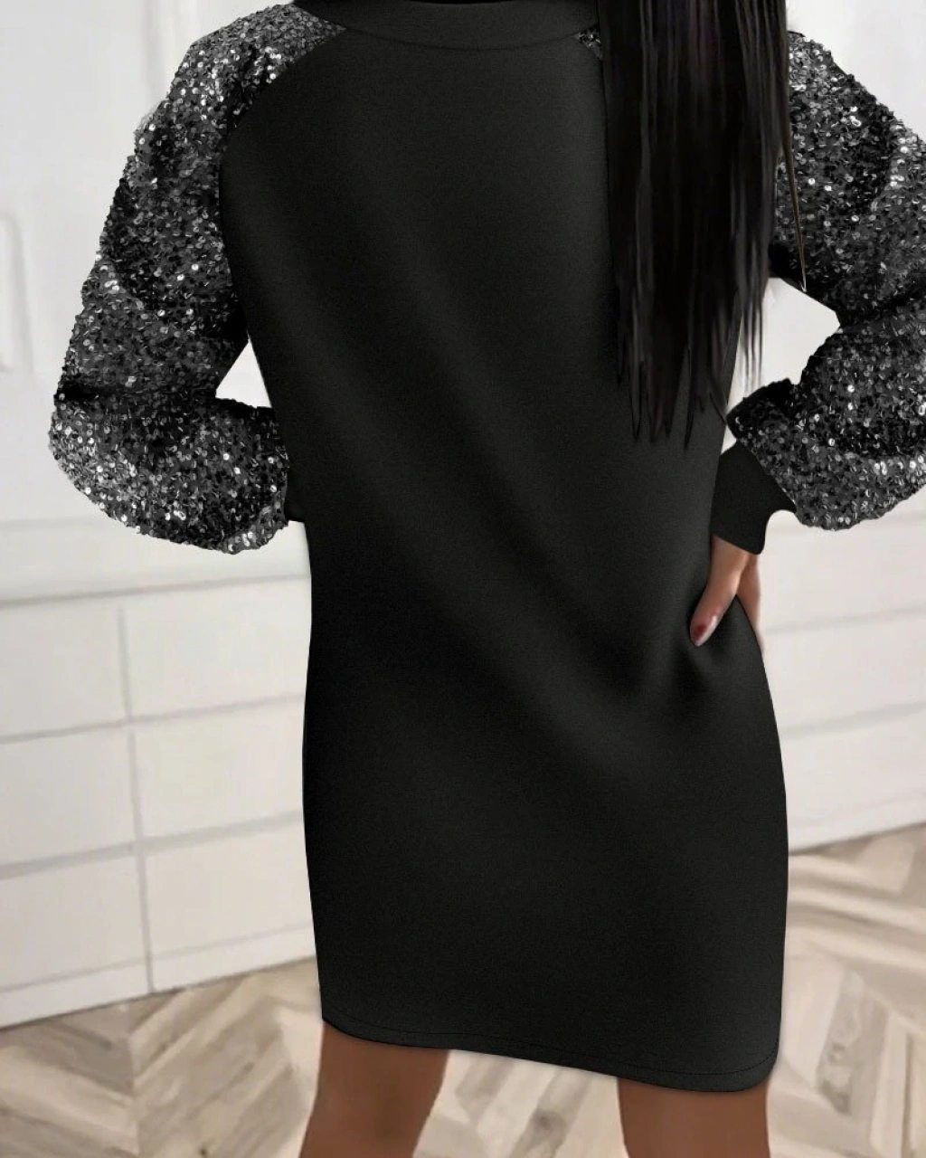 Kadın Uzun Kollu Pulpayetli Bağcıklı Cep Detaylı Mini Viskon Iki Iplik Elbise