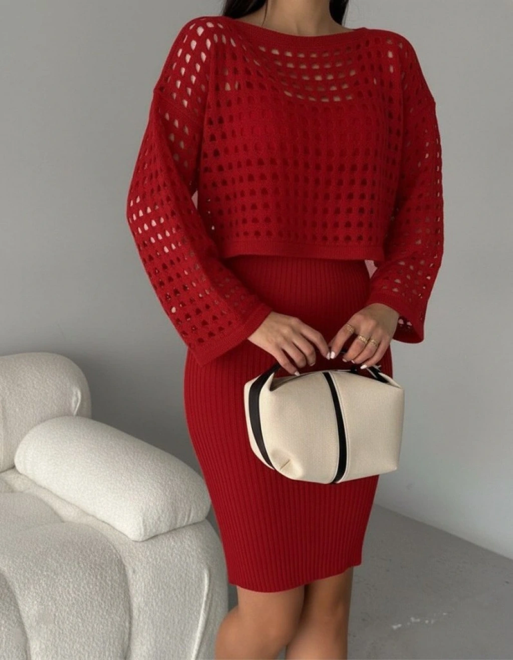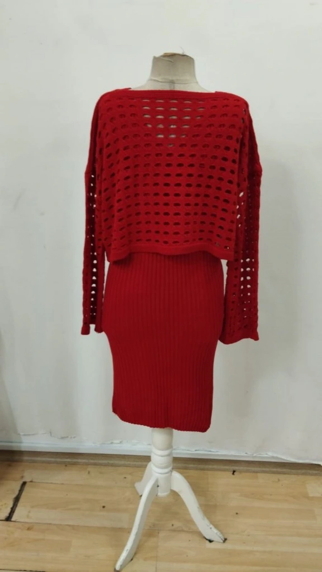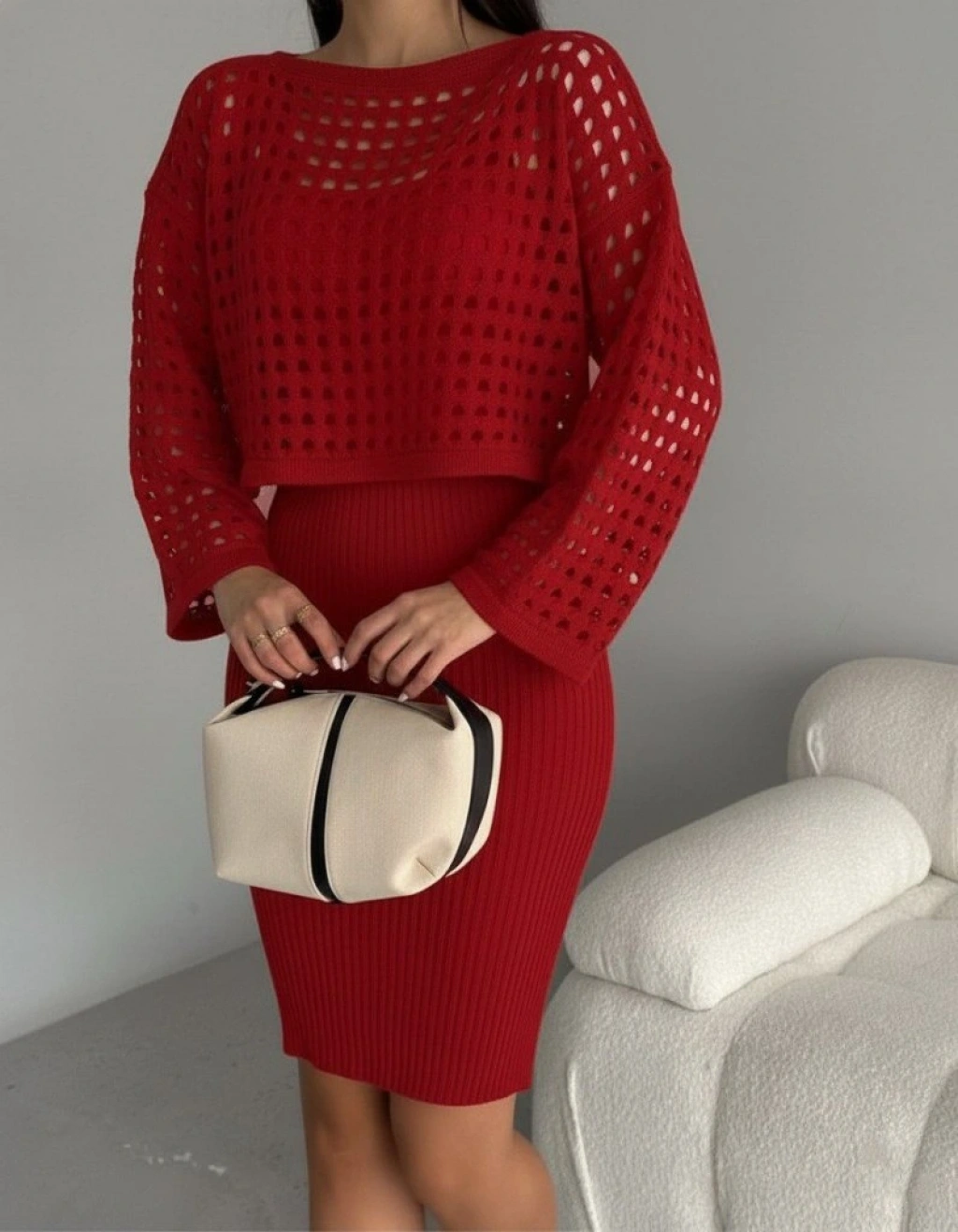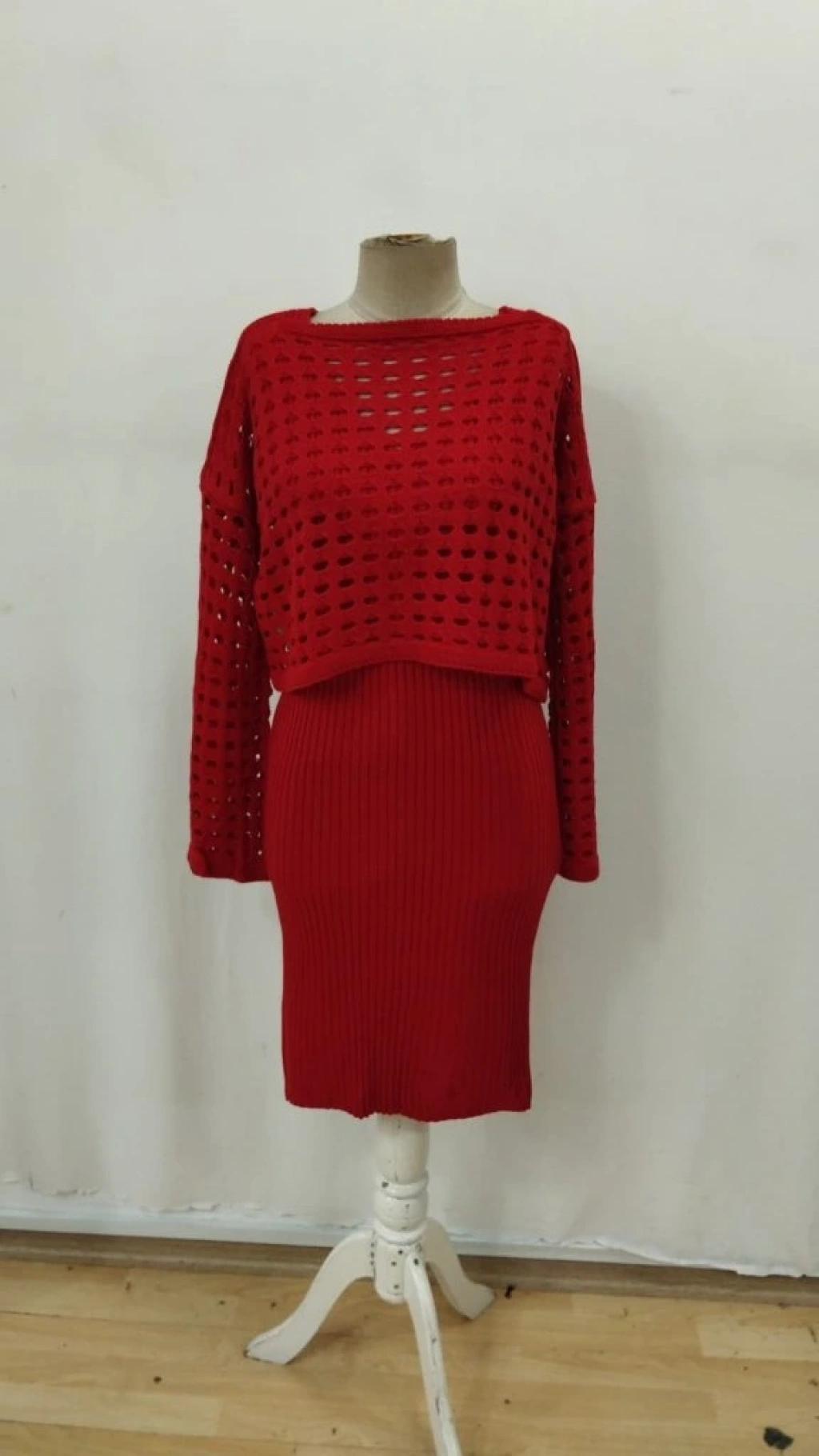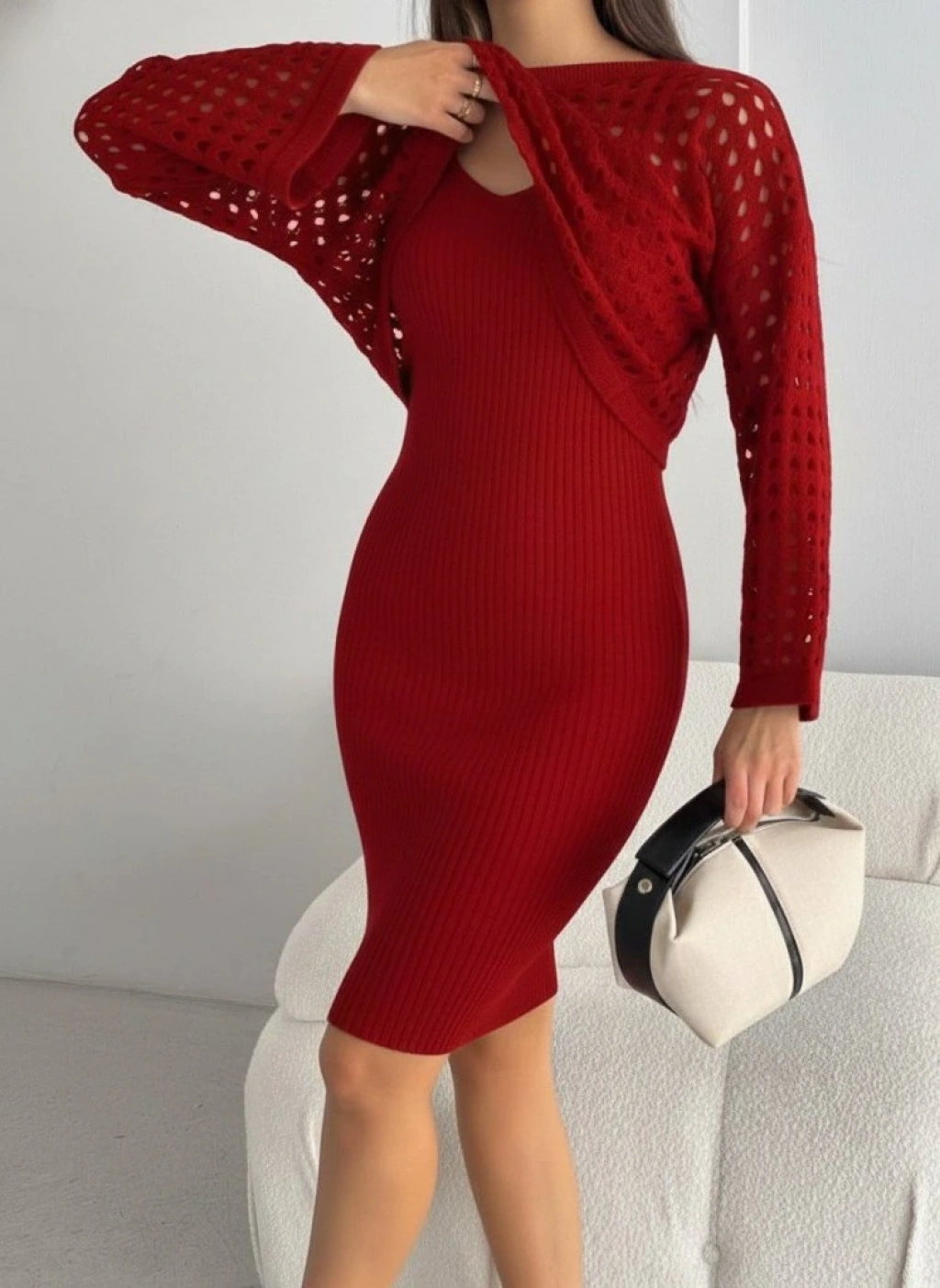 Kadın Uzun Kollu Delikli Kazak Askılı Elbise Triko Ikili Takım