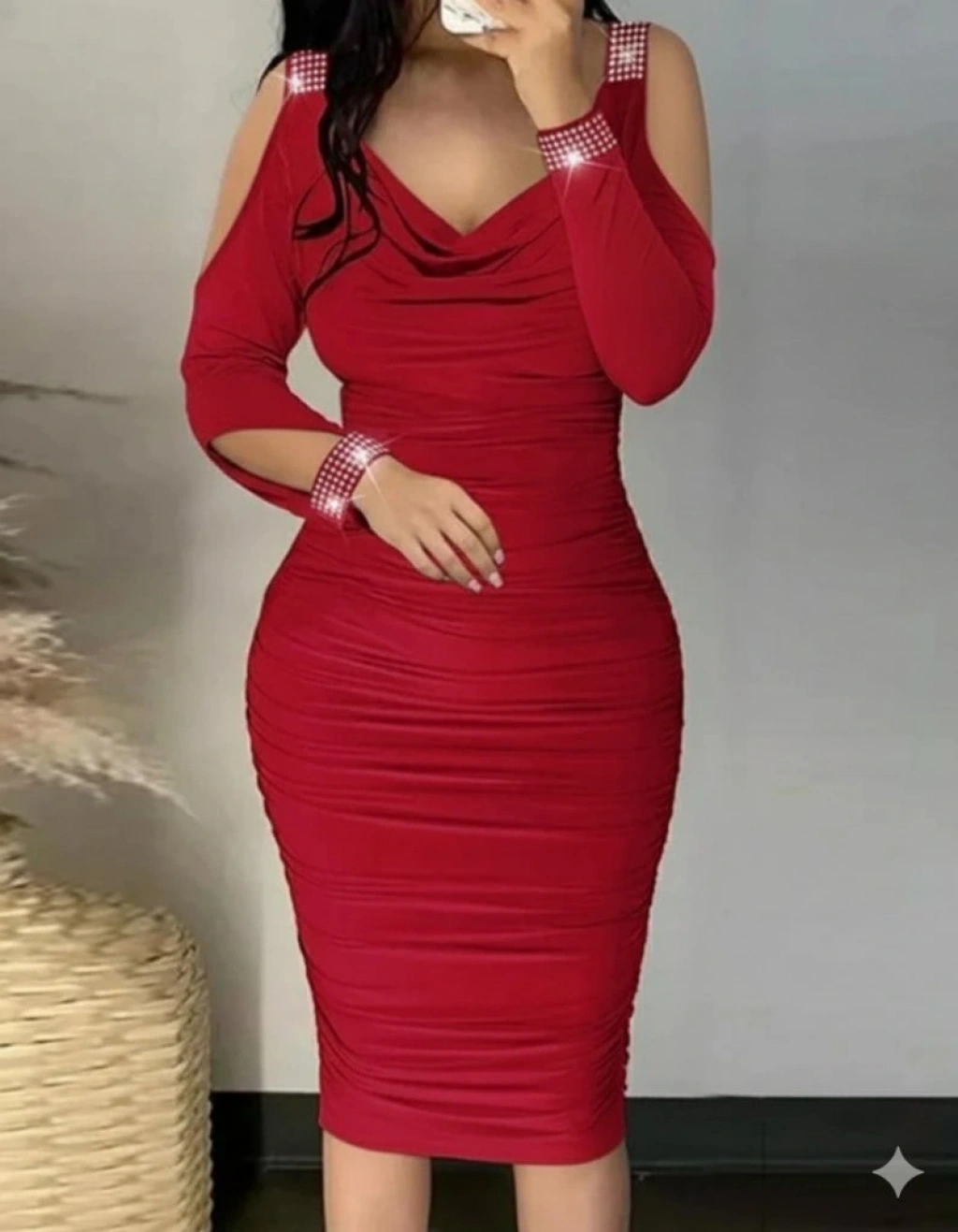 Kadın Omuzlardan Açık Uzun Kollu Taşlı Degaje Yakalı Sandy Midi Elbise