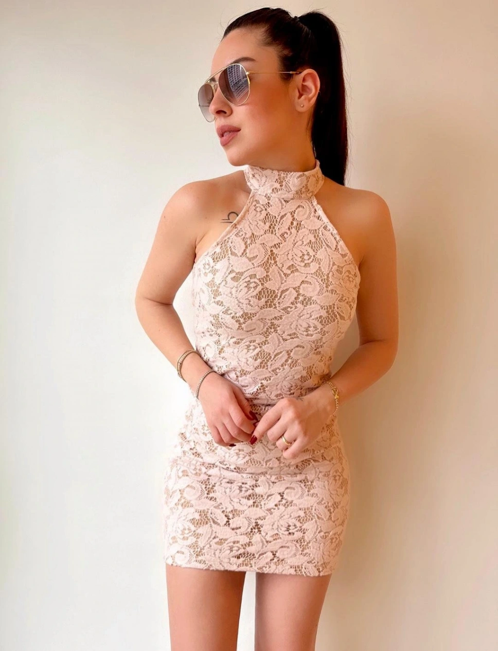Kadın Boyun Bağlamalı Full Likralı Astarlı Dantel Mini Elbise