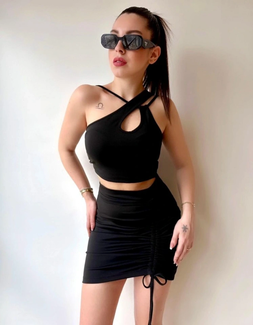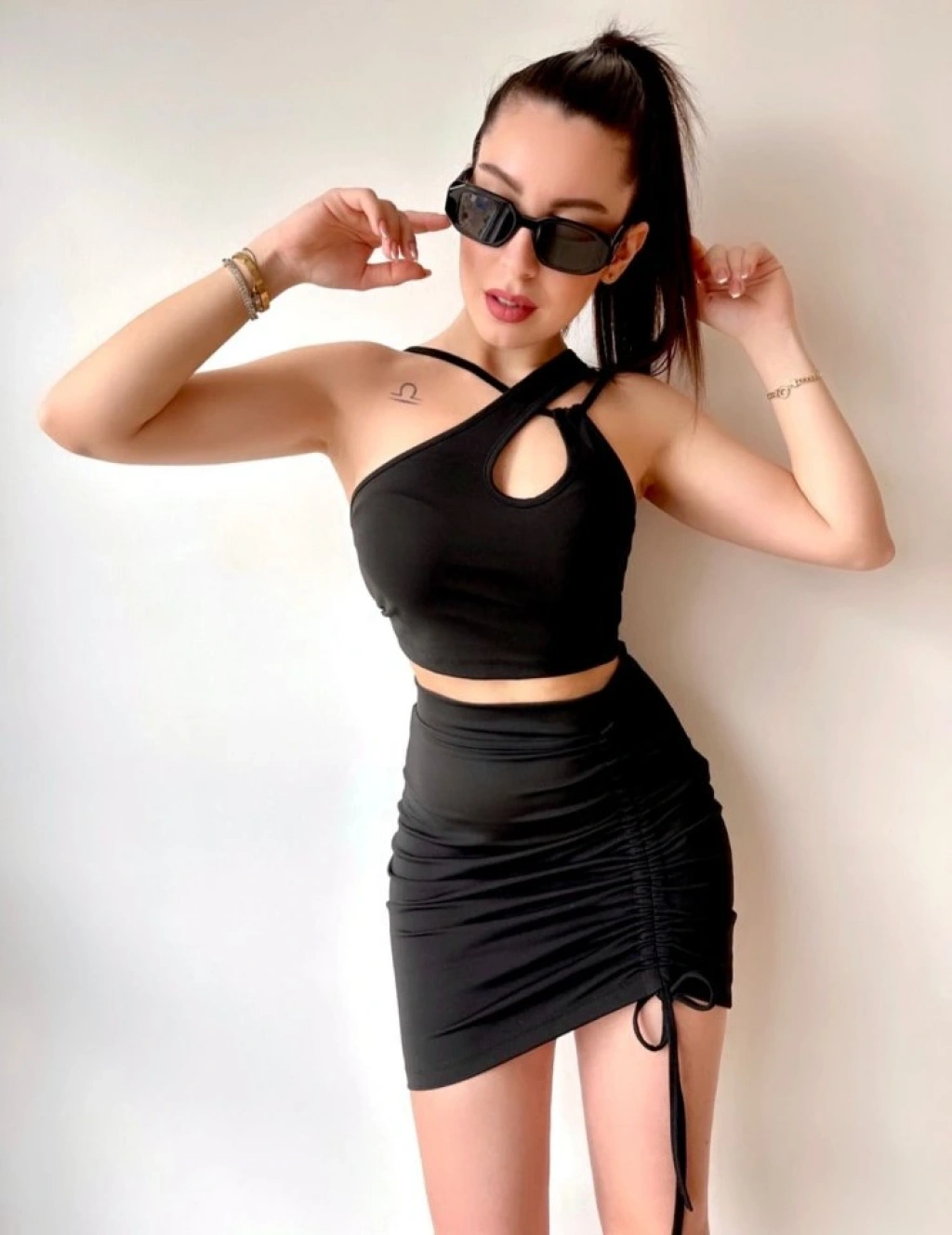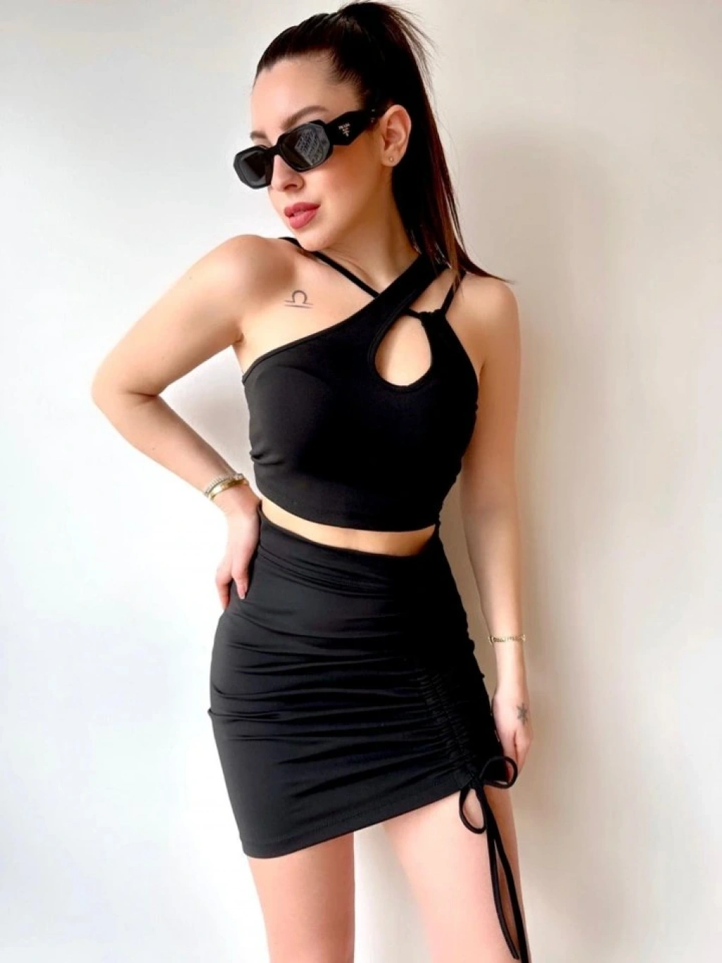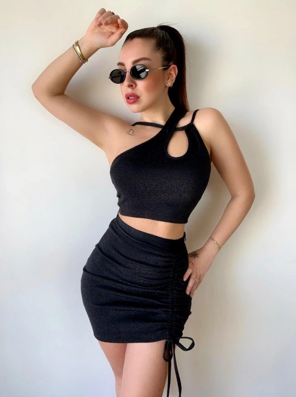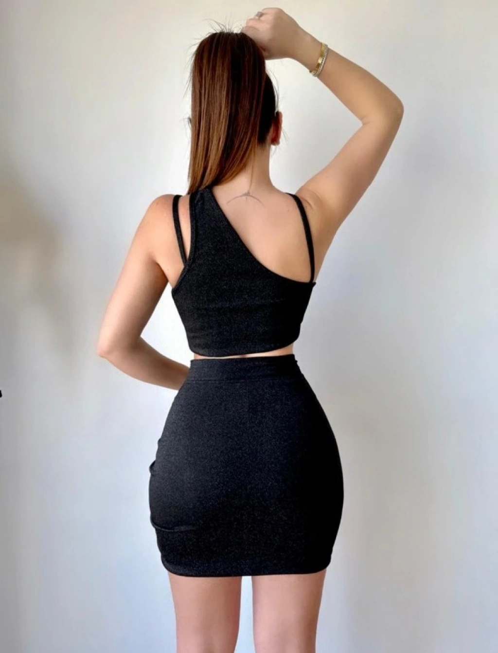 Kadın Asimetrik Yaka Detay Crop Ve Yüksek Bel Mini Etek Ikili Takim