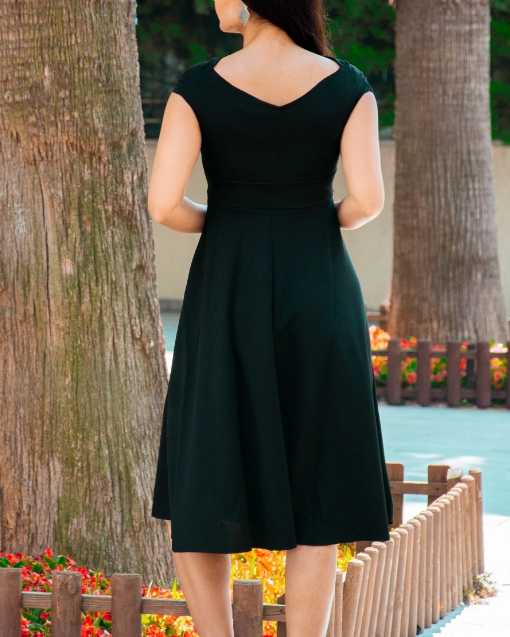 Düşük Omuz Eteği Pileli Krep Kumaş Midi Boy Elbise