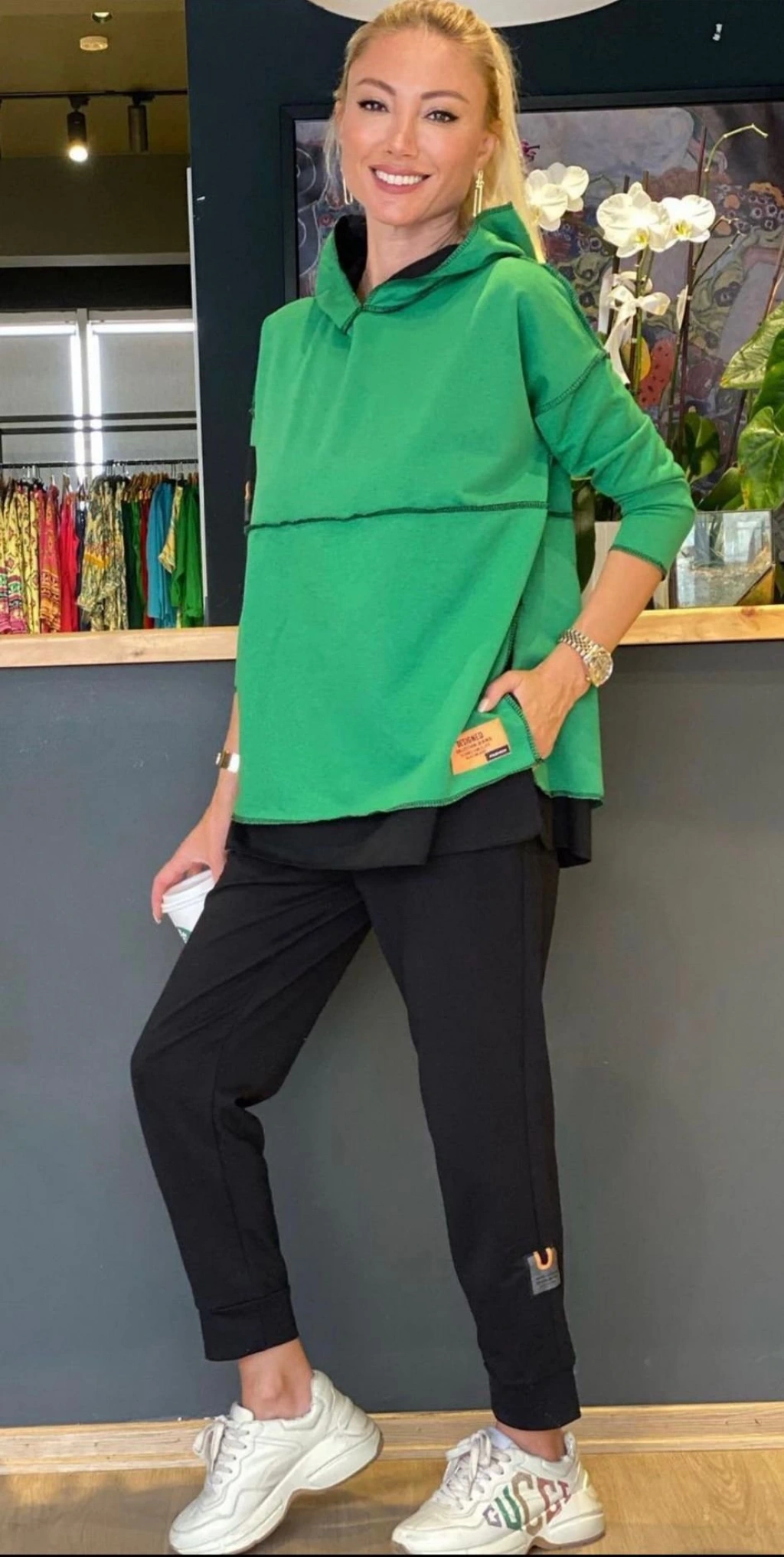 Kadın Yeşil Kapşonlu Etek Ucu Detay Arma Ters Dikiş Gorunumlu Ikili Takım