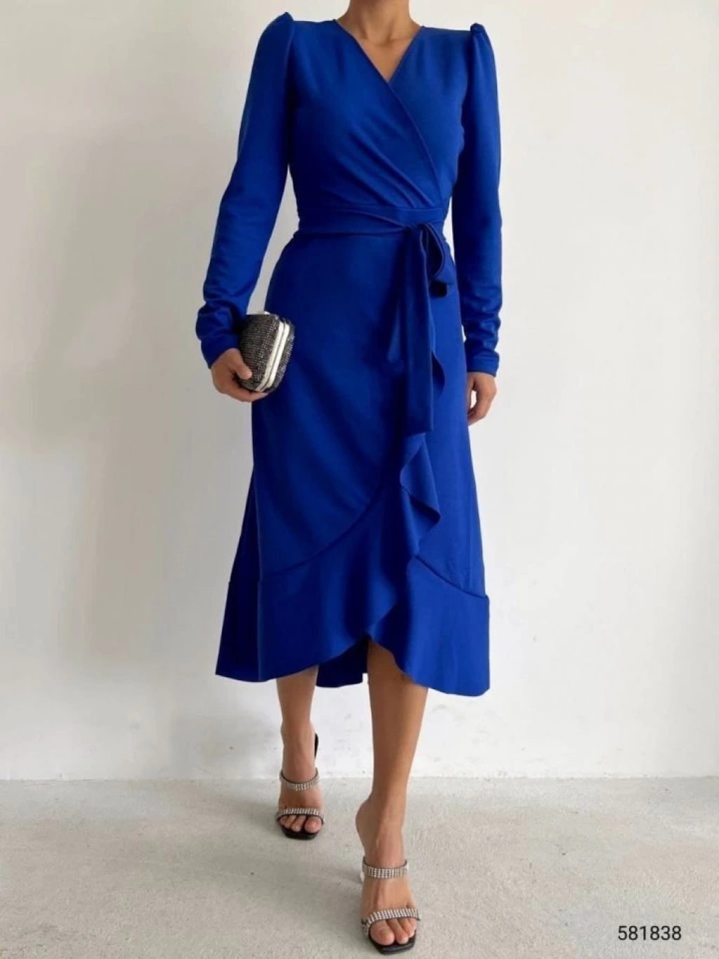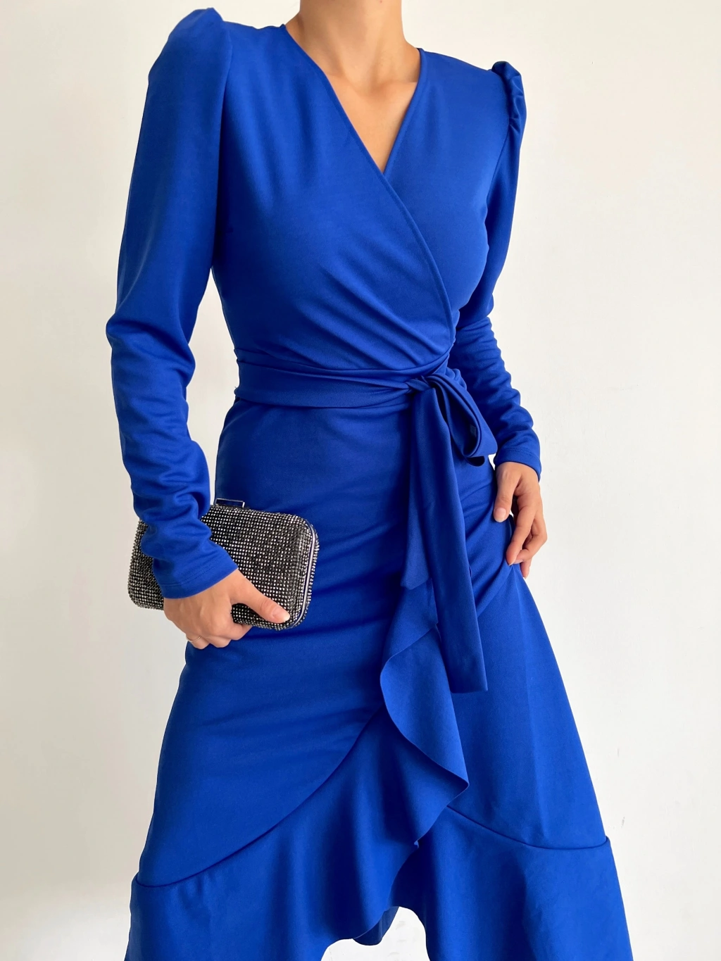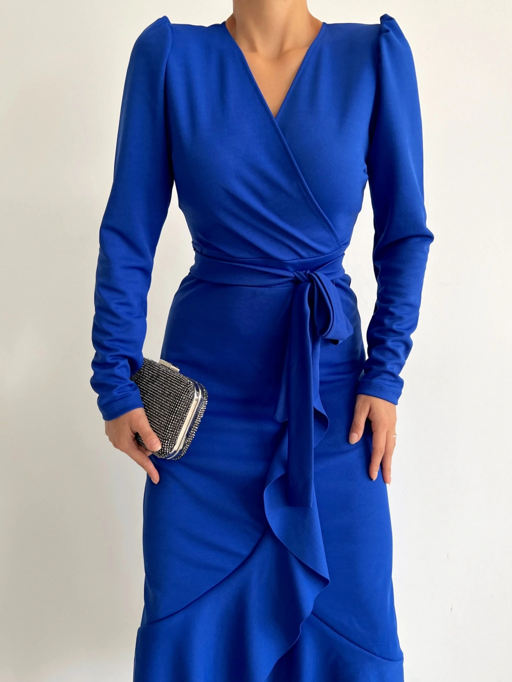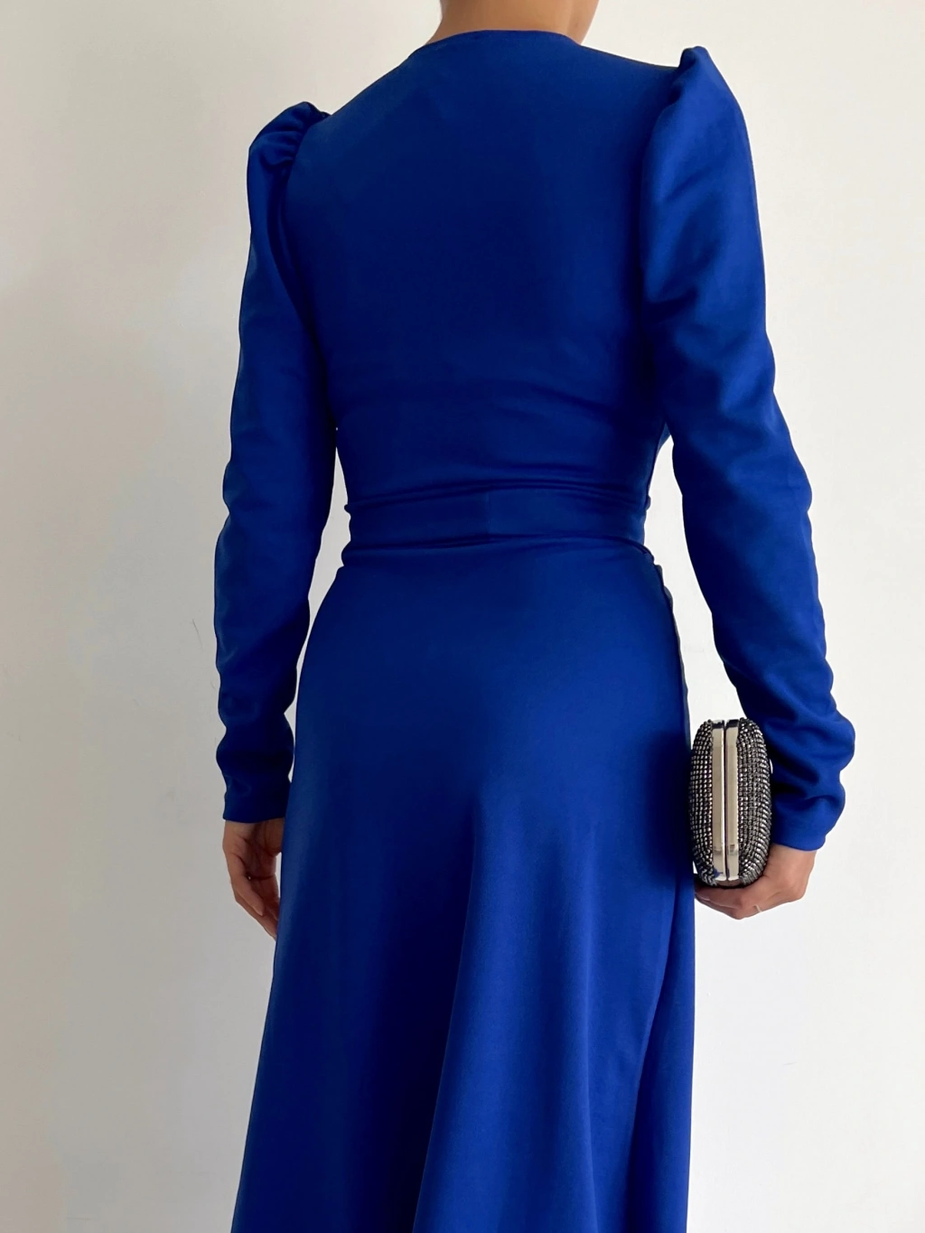 Krep Kumaş Midi Boy Kuşaklı Uzunkol Elbise