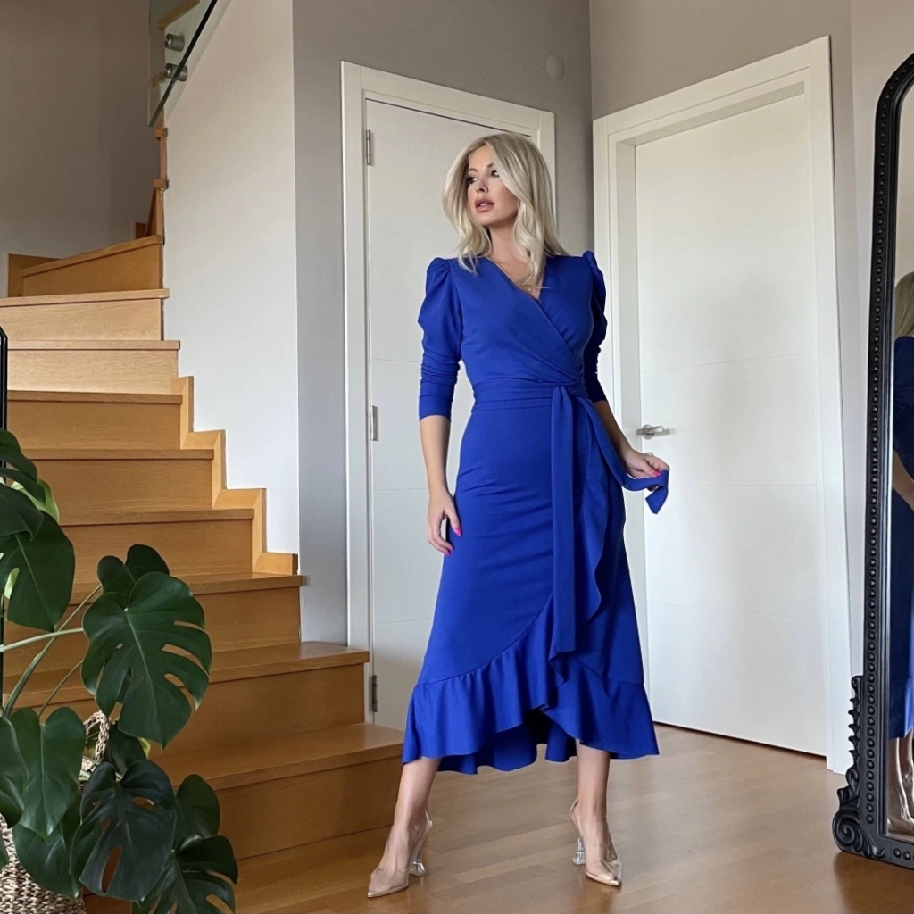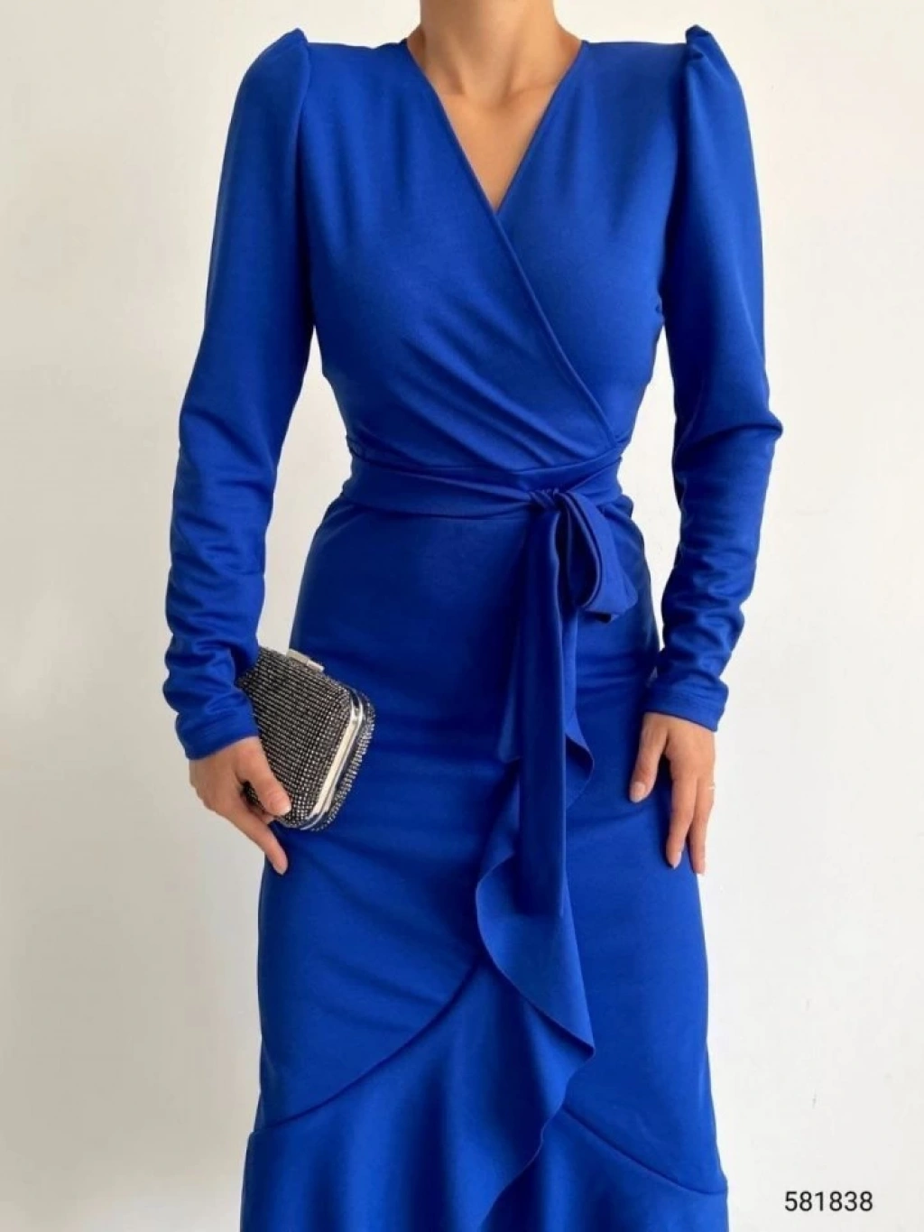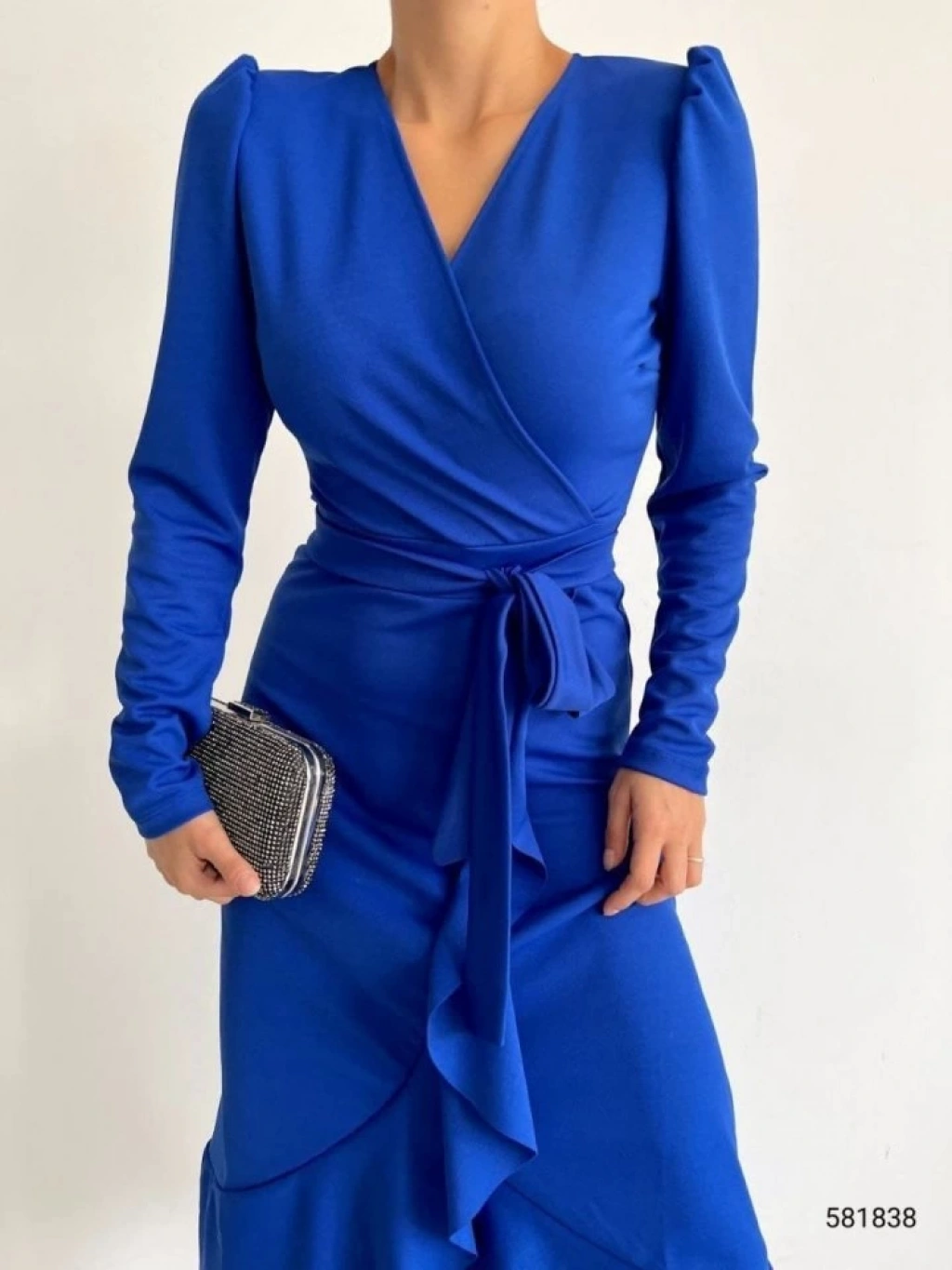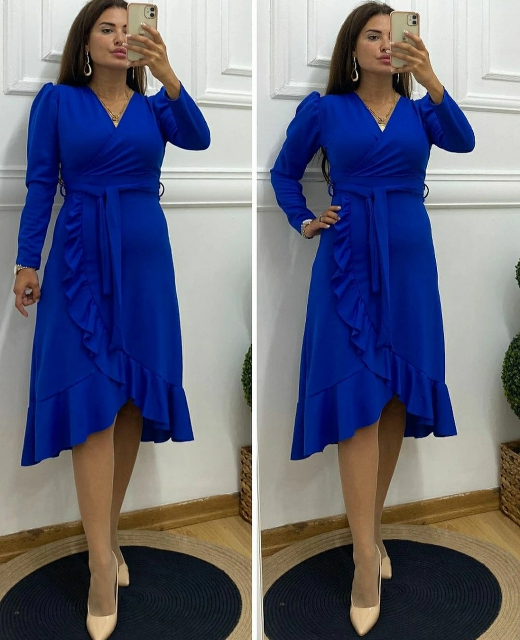 Krep Kumaş Midi Boy Kuşaklı Uzunkol Elbise