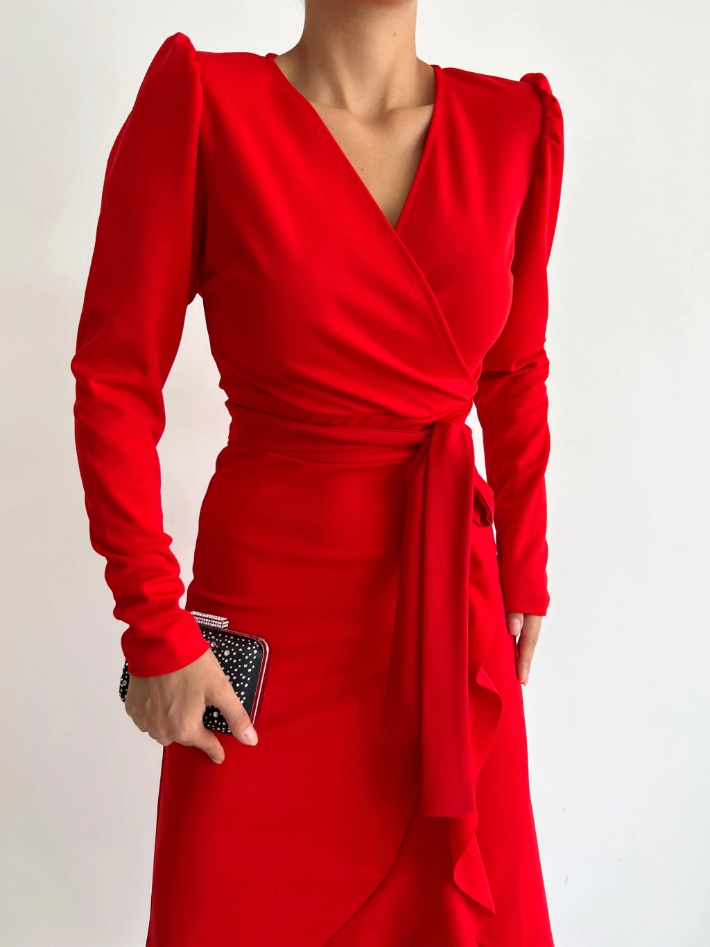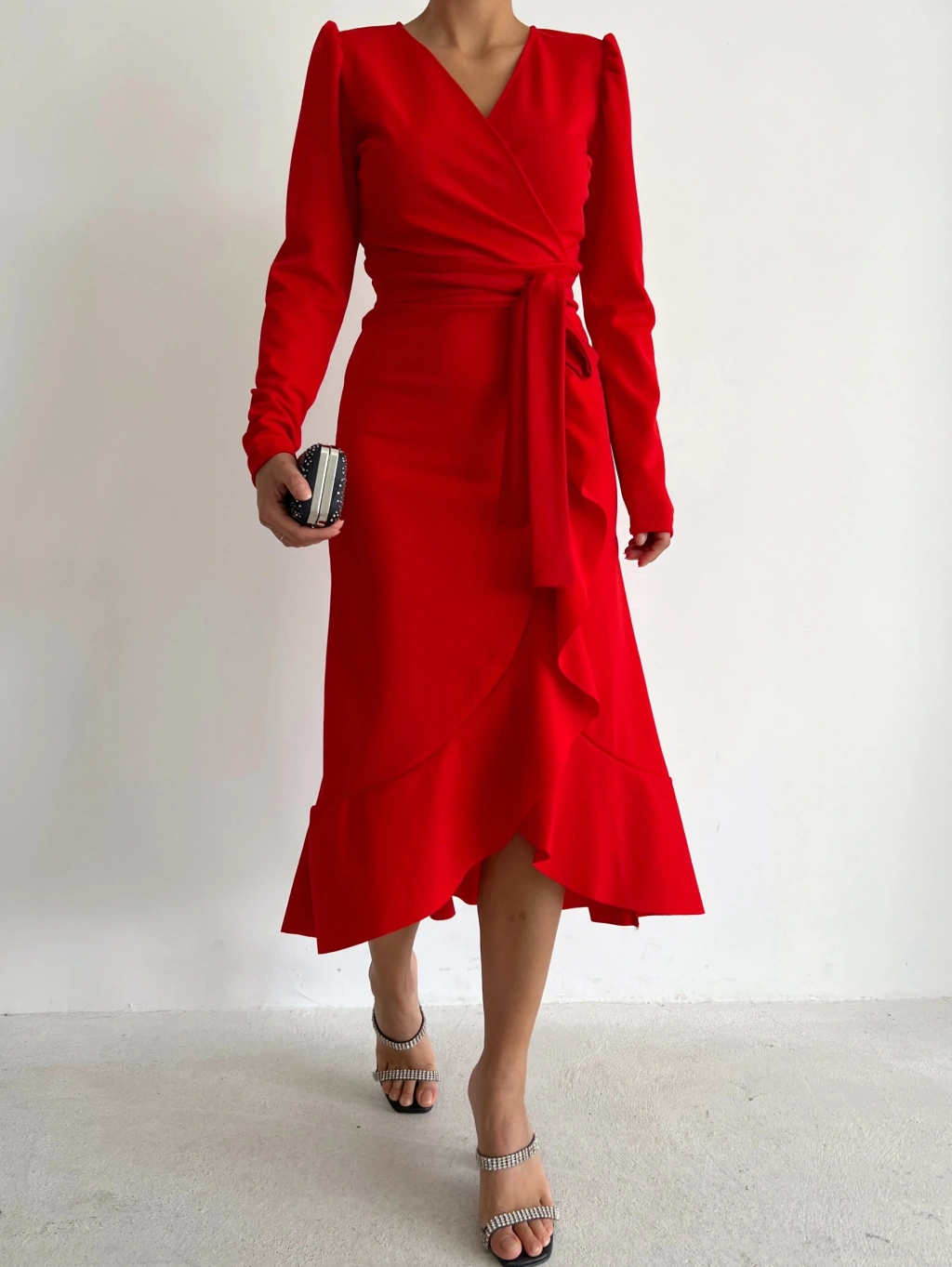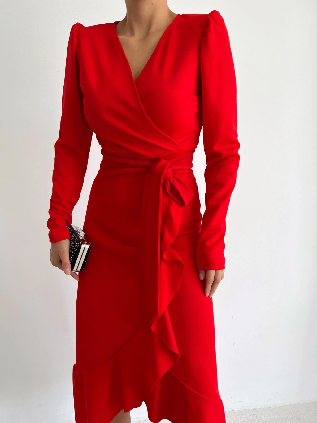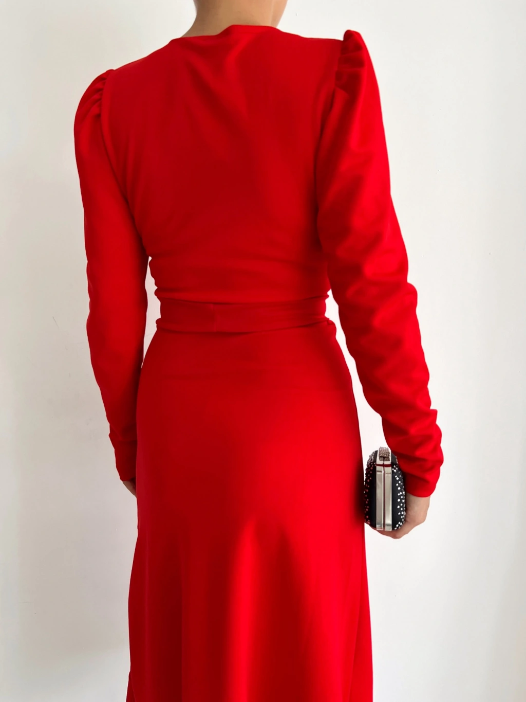 Krep Kumaş Midi Boy Kuşaklı Uzunkol Elbise