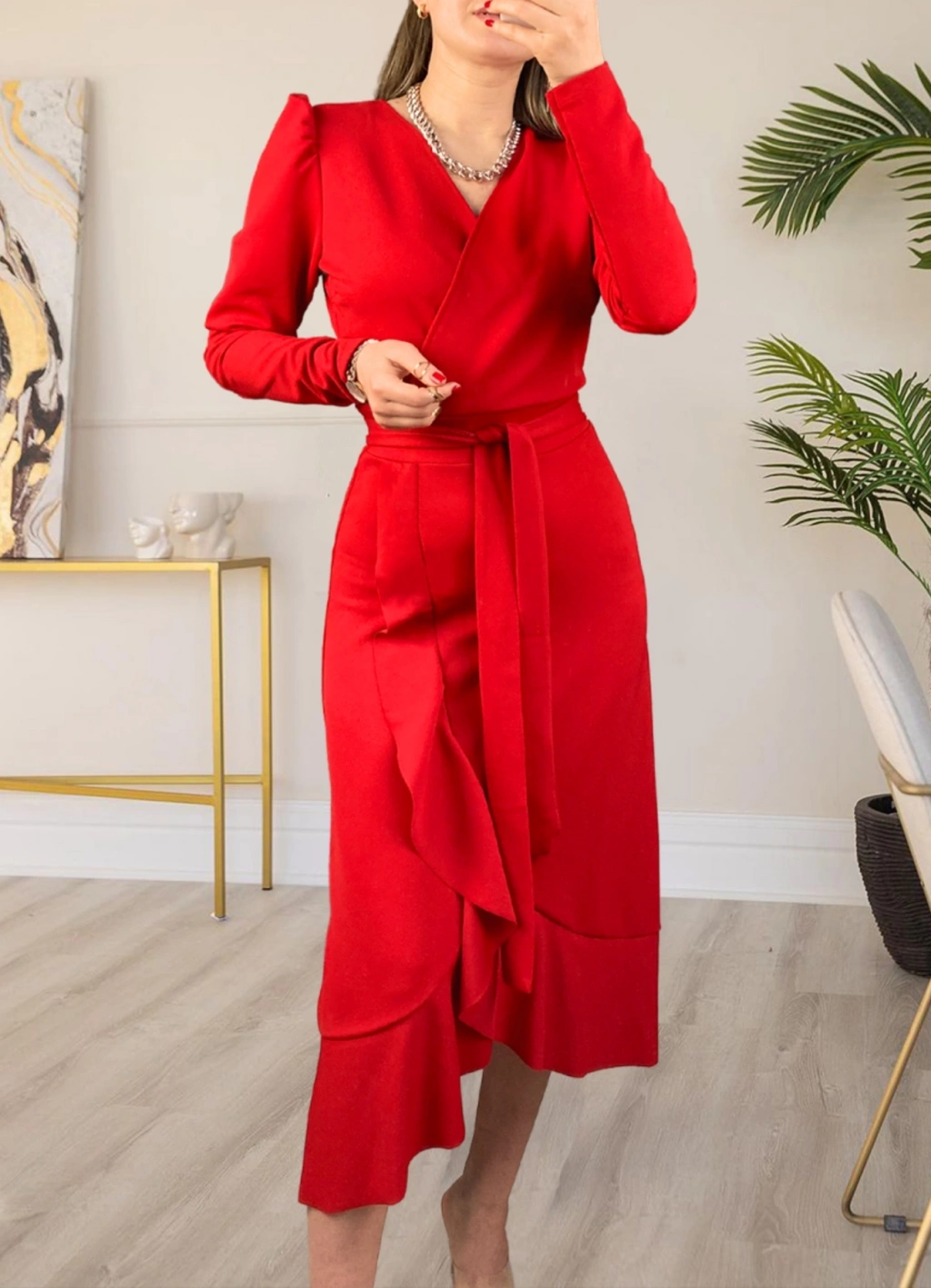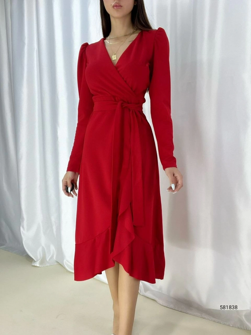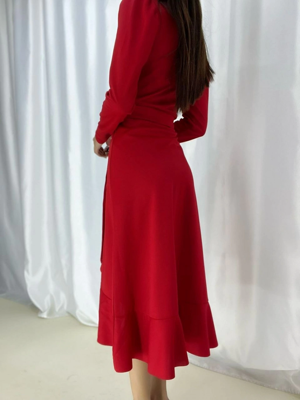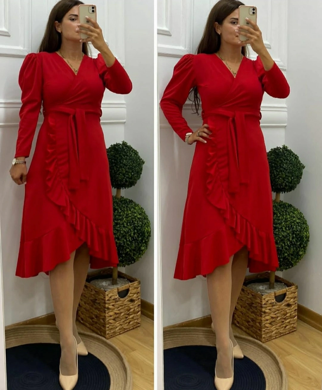 Krep Kumaş Midi Boy Kuşaklı Uzunkol Elbise