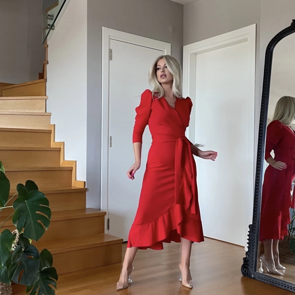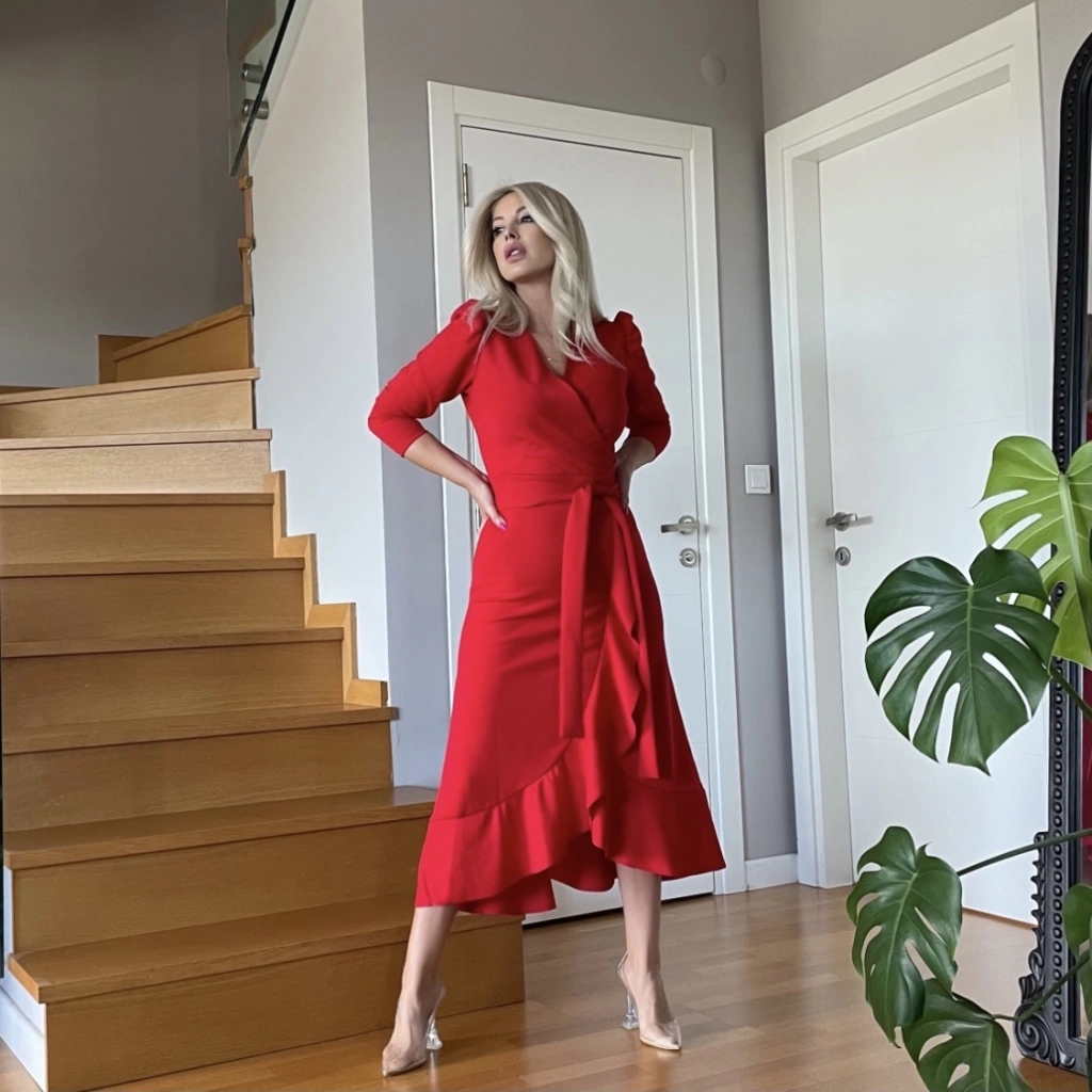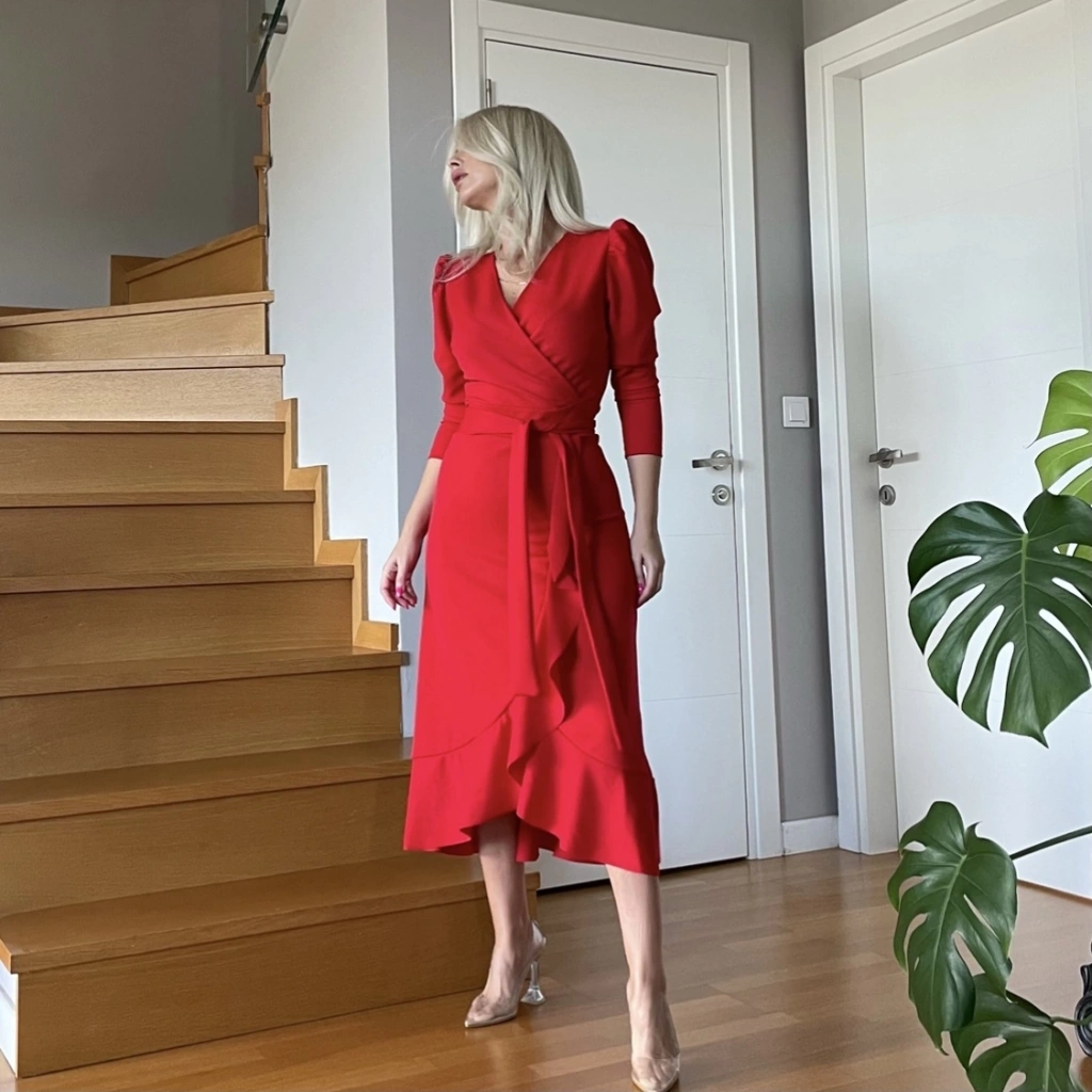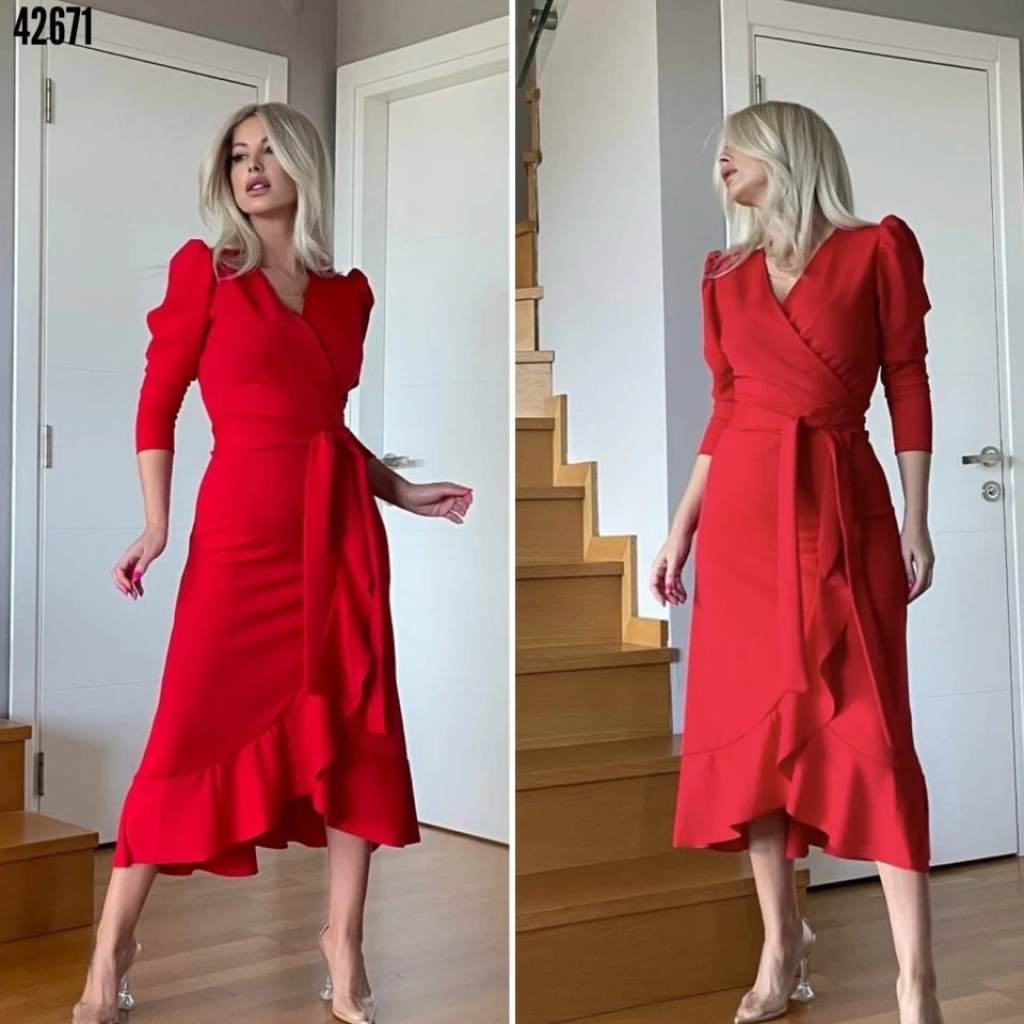 Krep Kumaş Midi Boy Kuşaklı Uzunkol Elbise