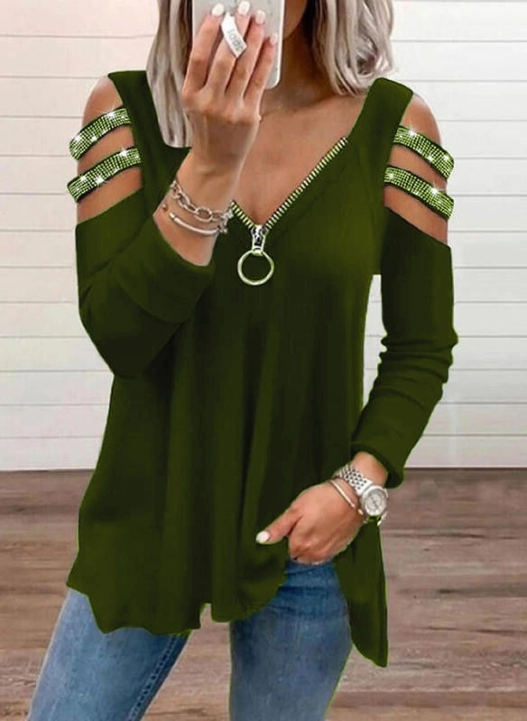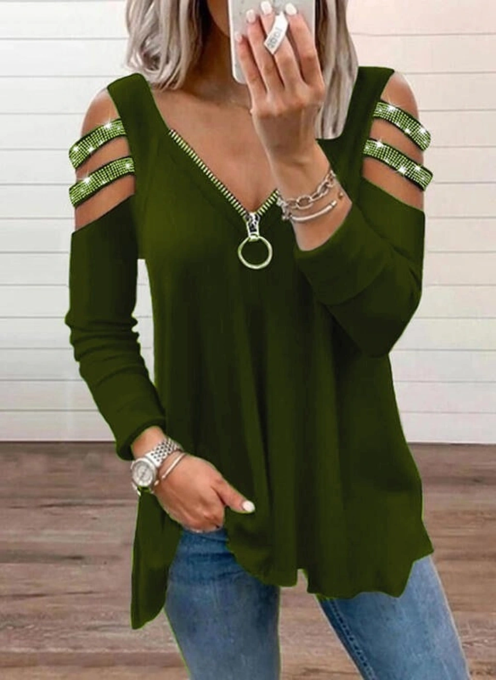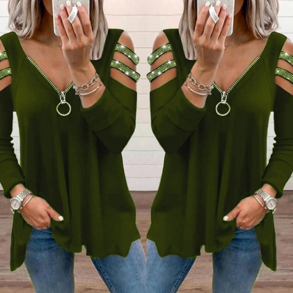 Kadın Haki Kolları Taş Işlemeli Uzun Kol Fermuarlı Viskon Bluz