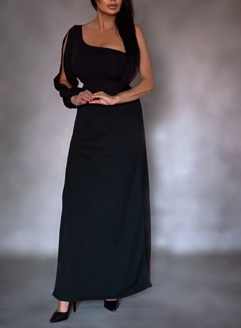 Tek Omuz Açık Derin Yırtmaçlı Krep Tam Boy Elbise