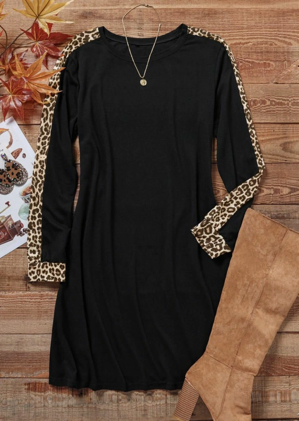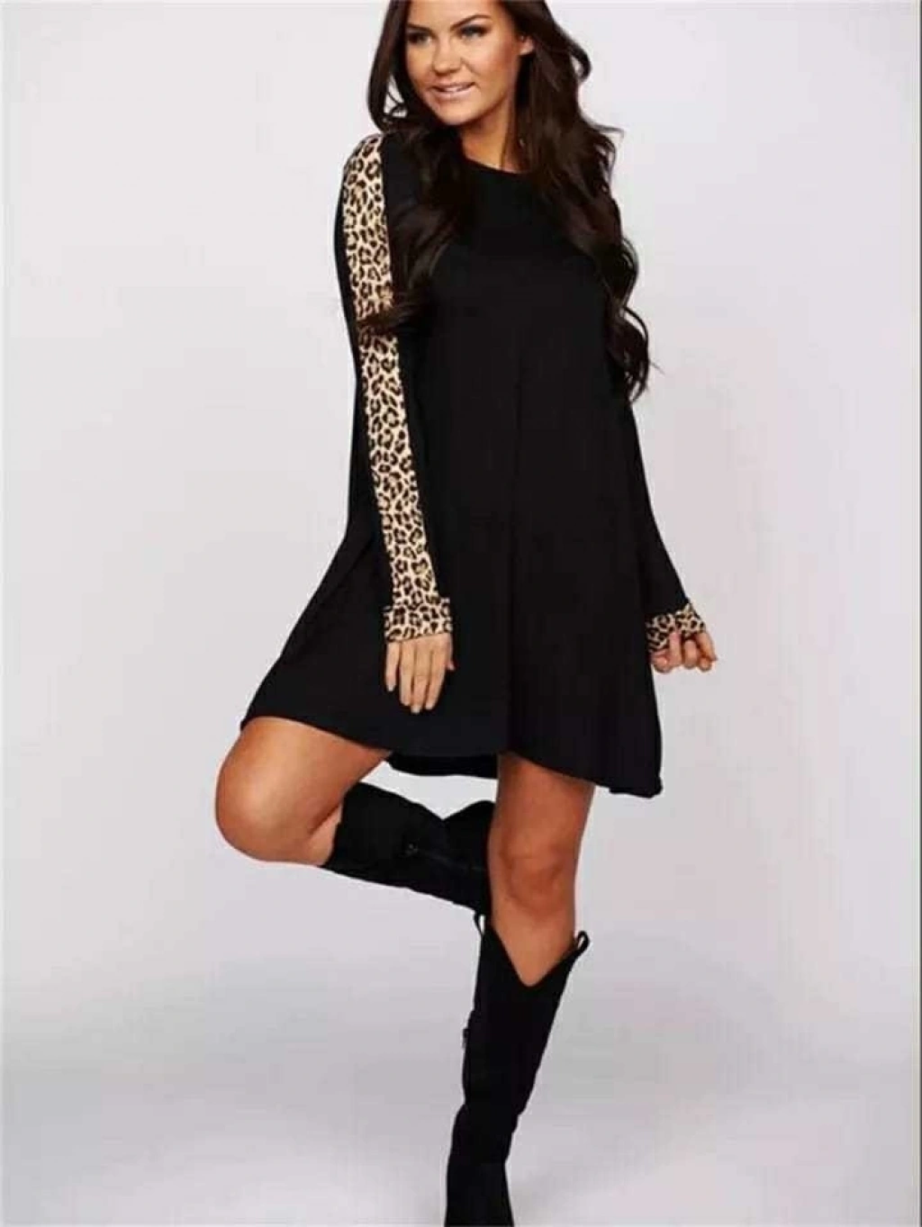 Kadın Uzun Kollu Bisiklet Yaka Kollar Leopar şeritli Salaş Iki Iplik Elbise