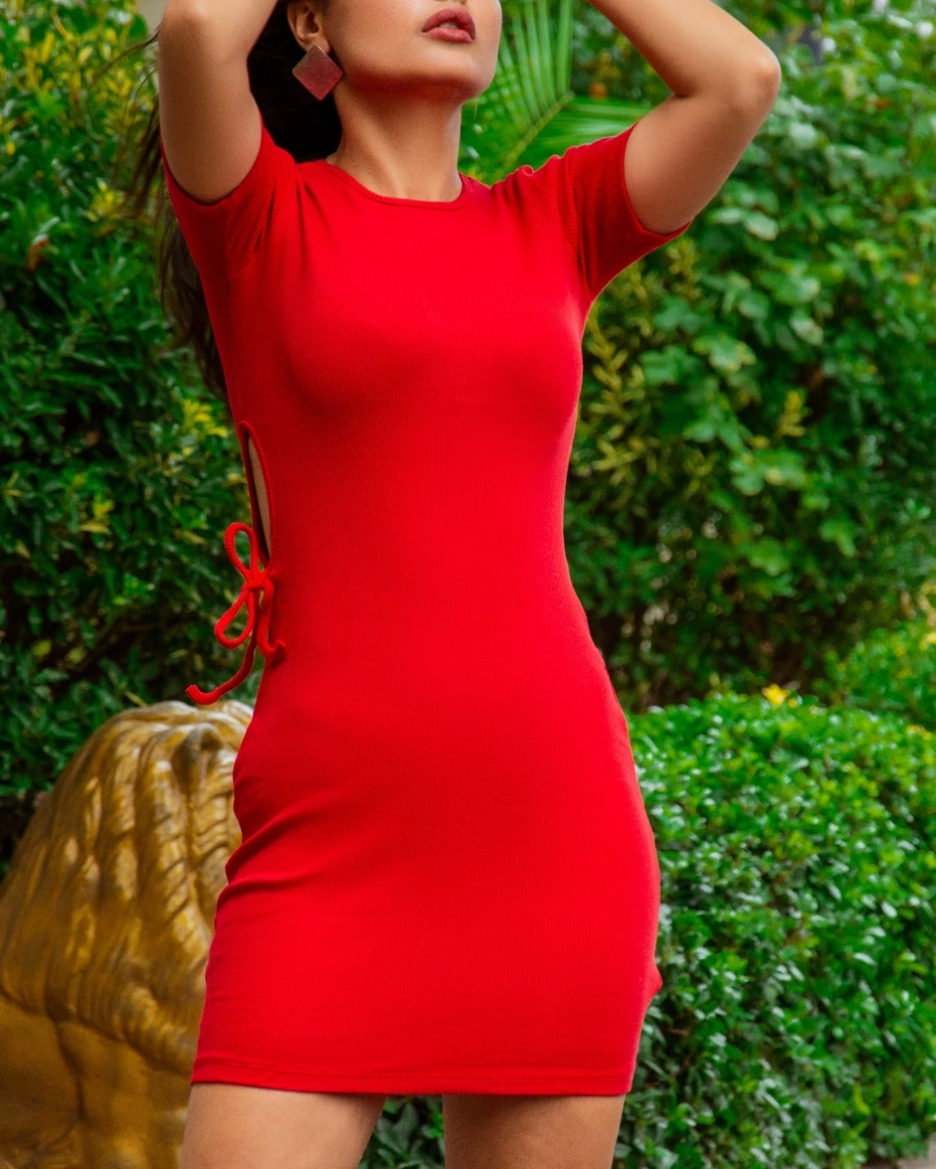 Kadın Kırmızı Kısa Kol Bel Detay Kaşkorse Elbise