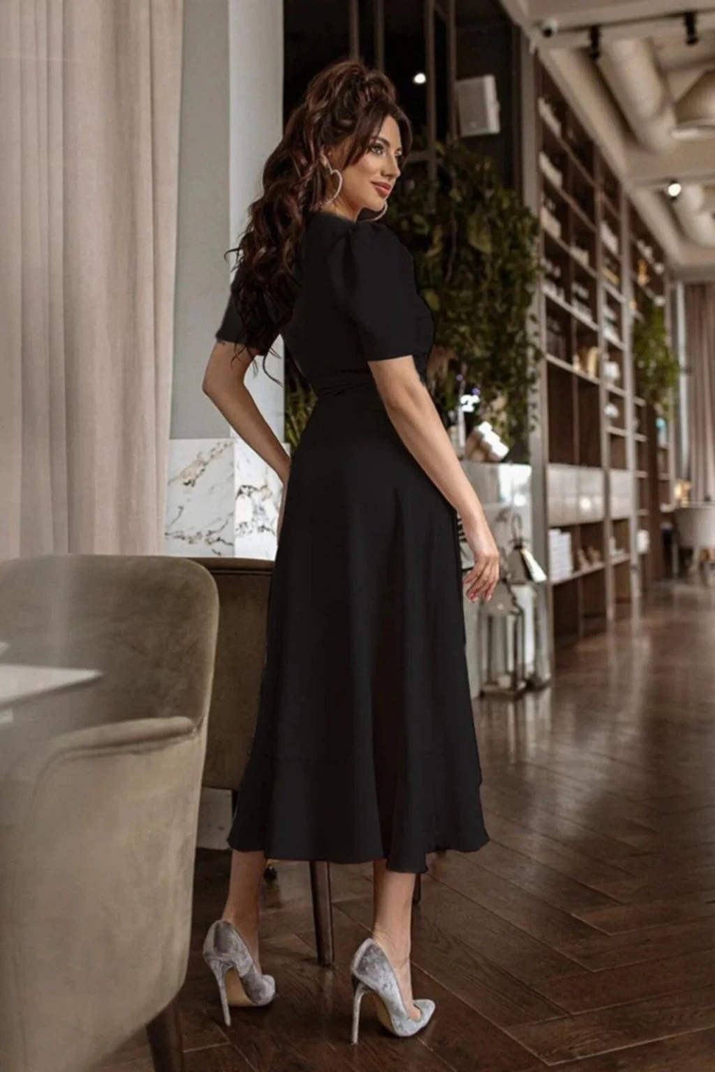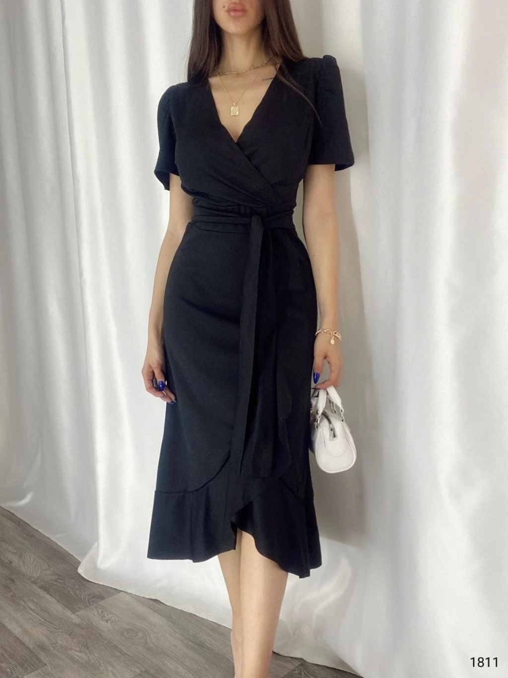 Kadın Kruvaze Yaka Midi Boy Kuşaklı Krep Elbise 120 Cm