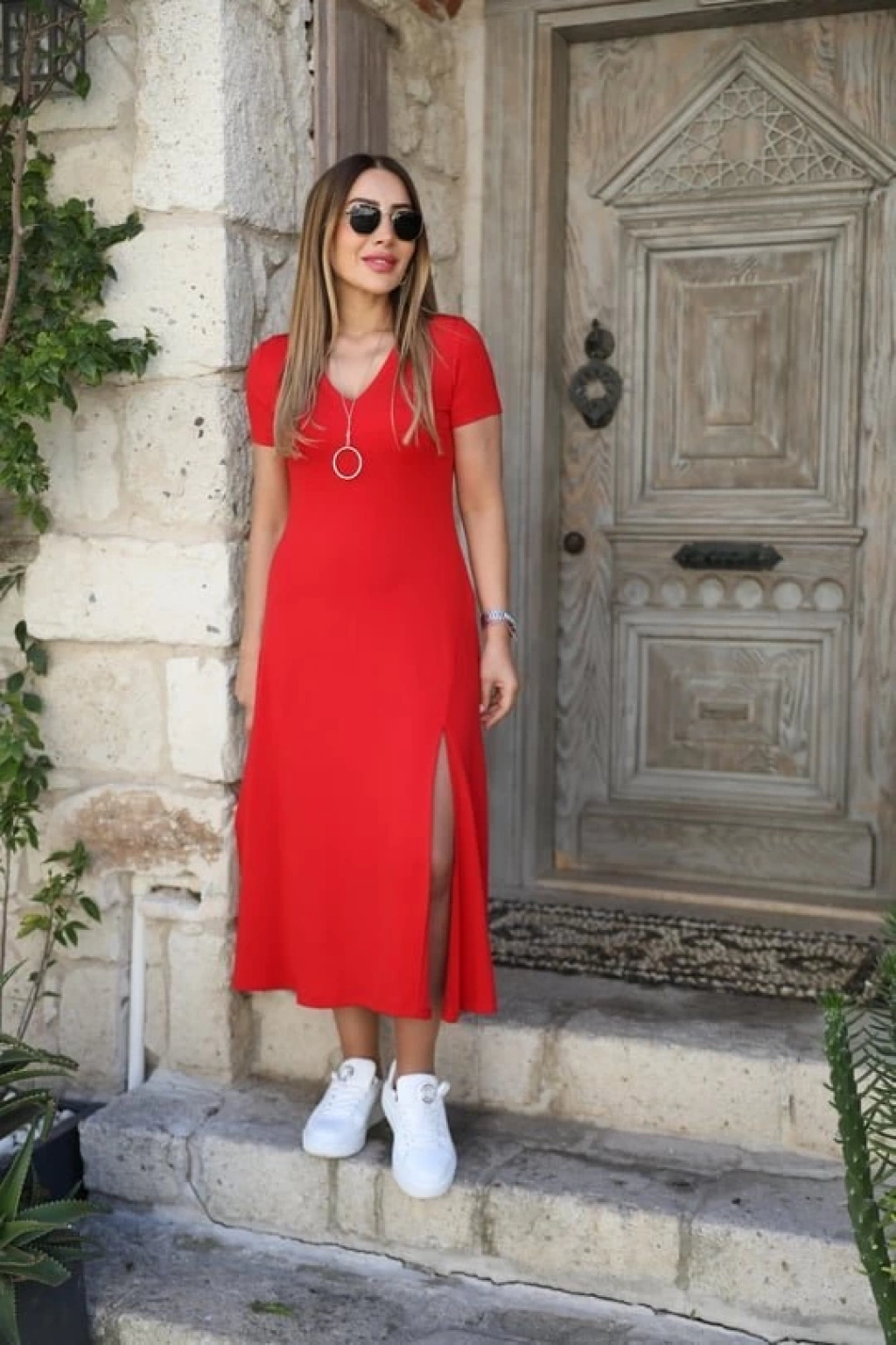 Kadın Kısa Kollu V Yaka Maxi Boy Elbise 124 Cm