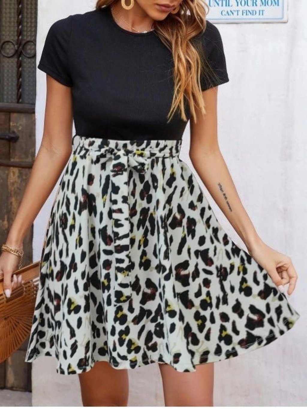 Kadın üst Kısa Kollu Viskon, Alt Leopar Desen Kuşaklı Krep Etek Takım