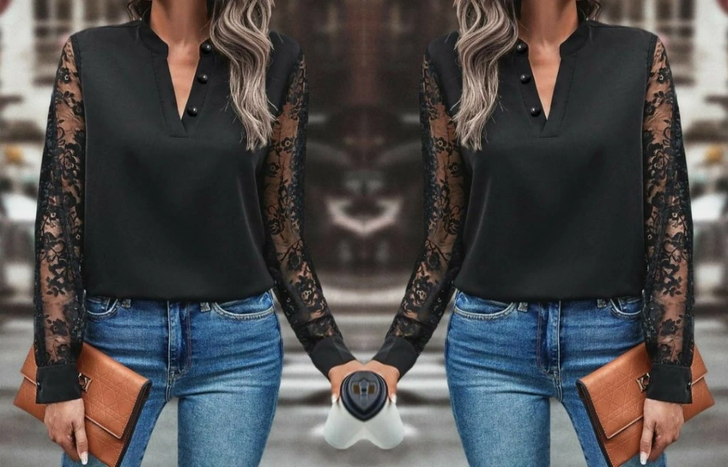 Kadın Uzun Kollu Yaka Düğme Detay Güpürlü Kol Krep Bluz