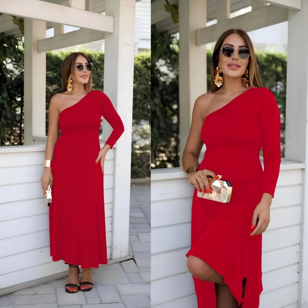 Kadın Uzun Kollu Tek Omuz Detay Krep Elbise