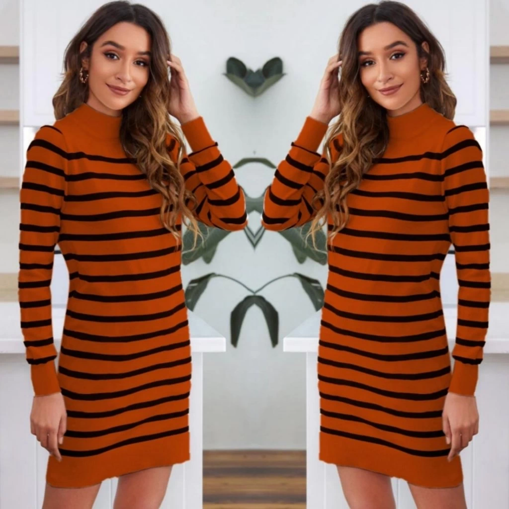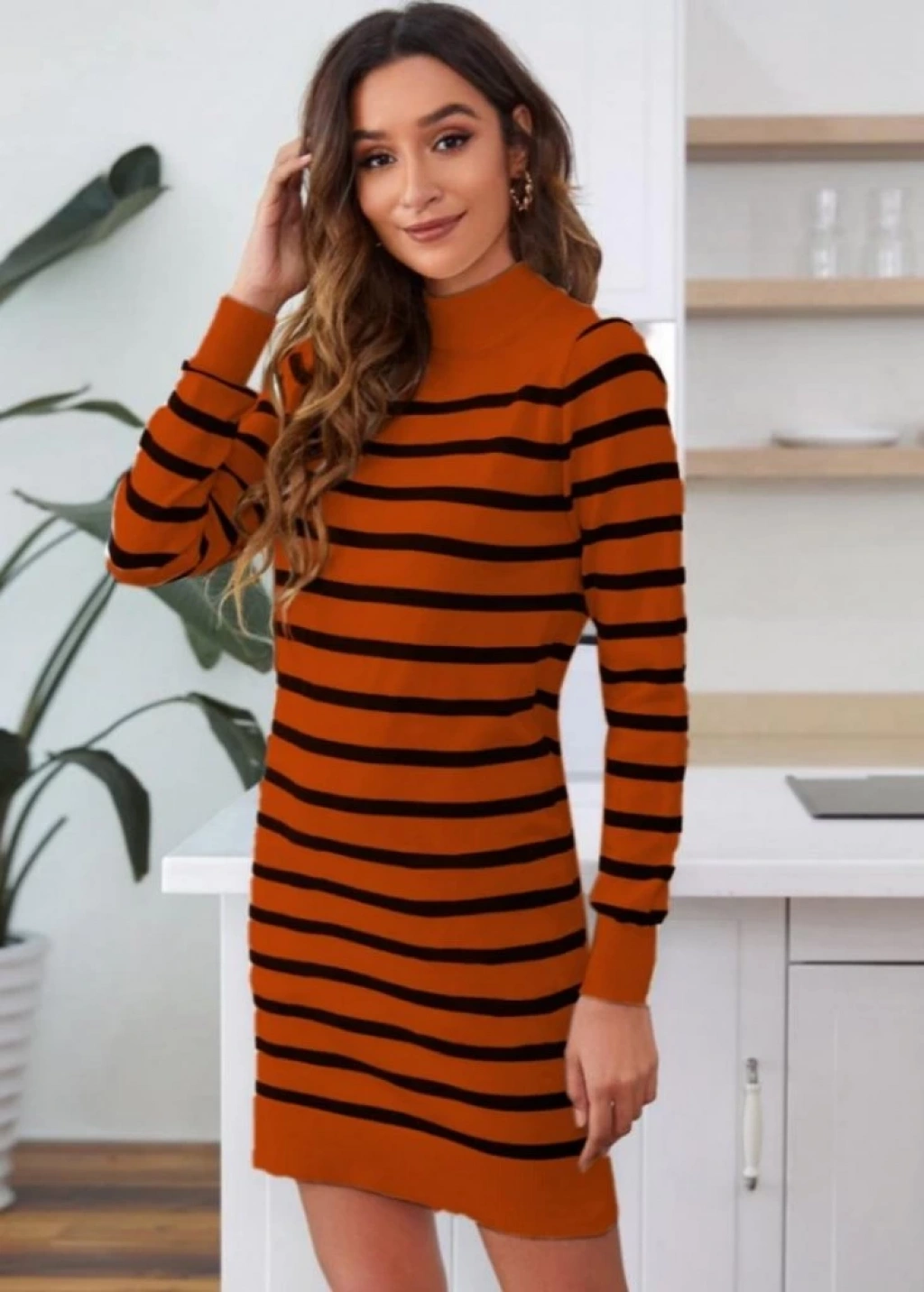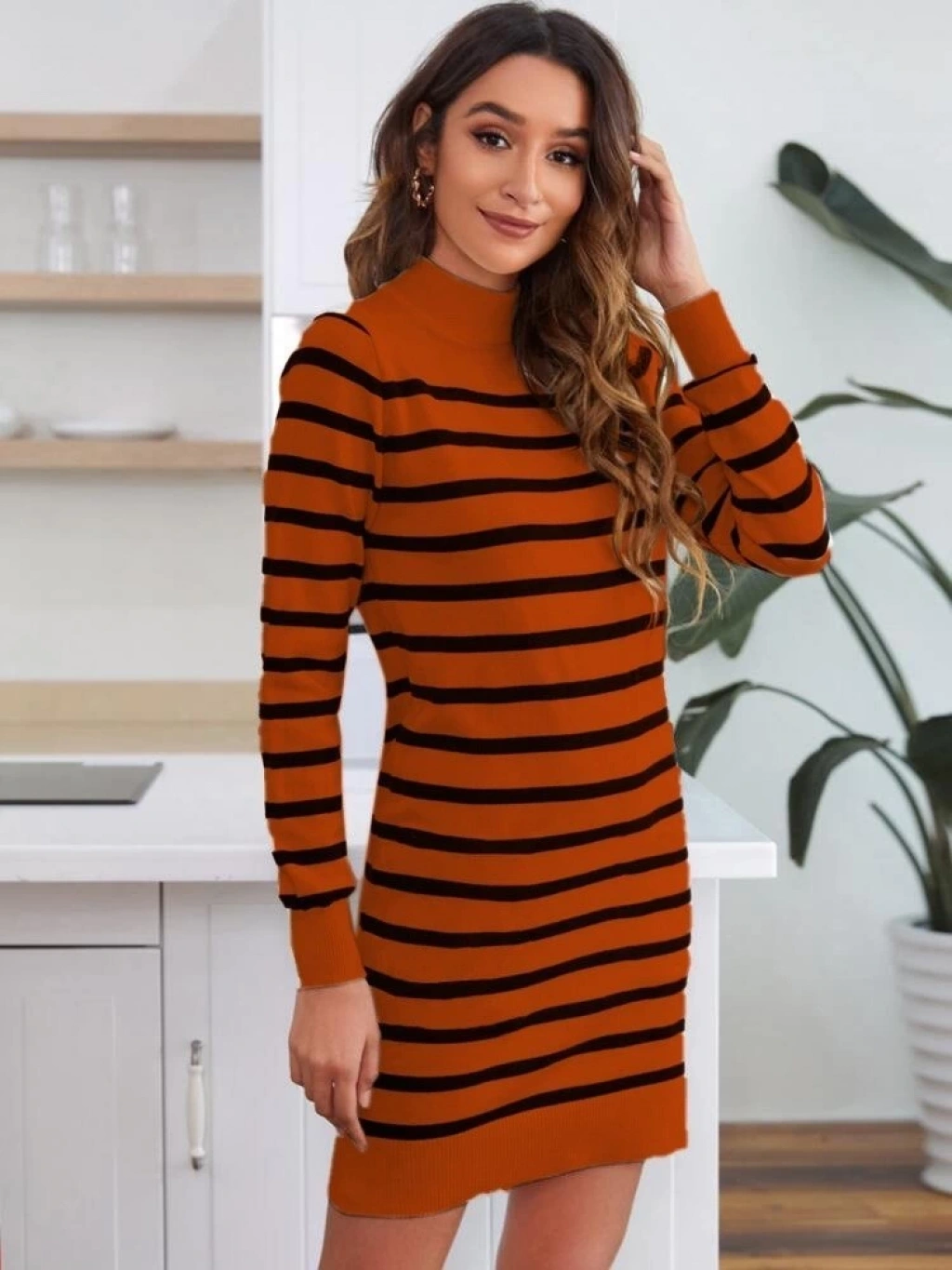 Kadın Uzun Kollu Yarım Balıkçı Yaka çizgilitriko Mini Boy Elbise (kemersiz)
