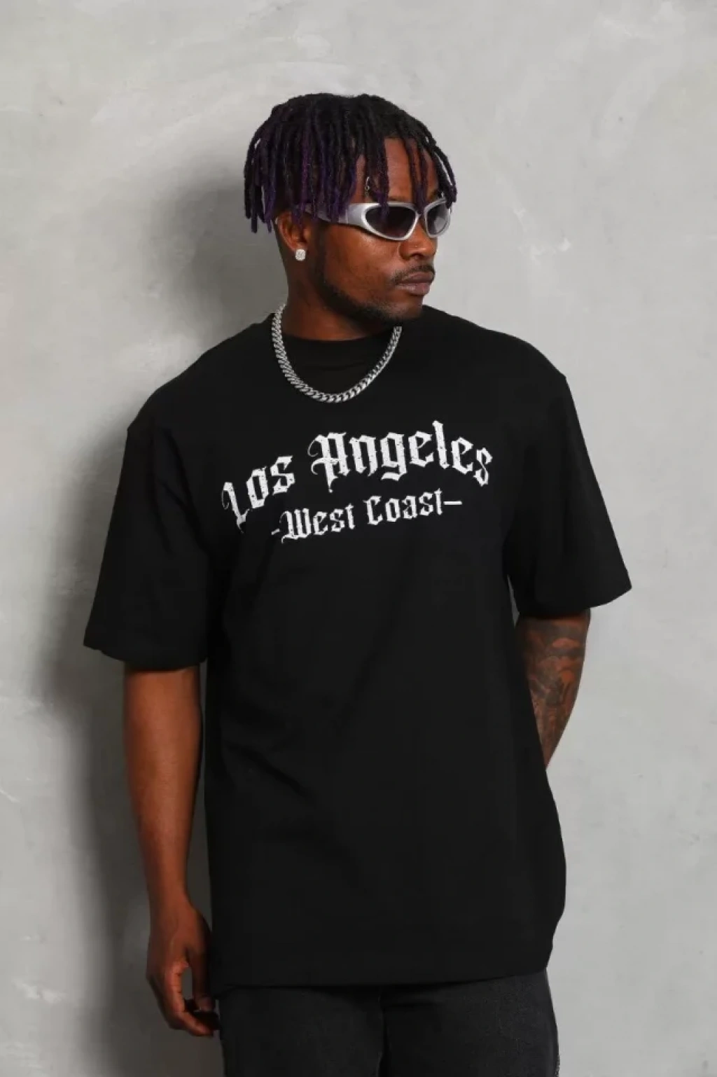 Unisex Oversize Baskılı Bisiklet Yaka T-Shirt - Siyah