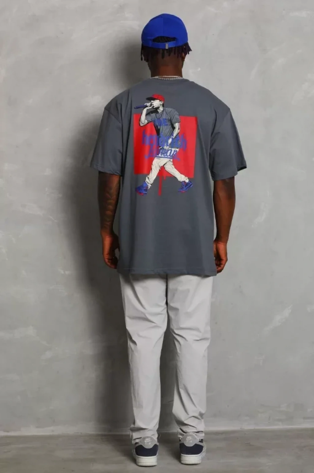 Unisex Oversize Baskılı Bisiklet Yaka T-Shirt - Füme