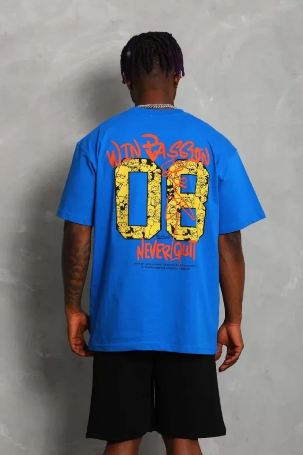 Unisex Oversize Baskılı Bisiklet Yaka T-Shirt - Mavi