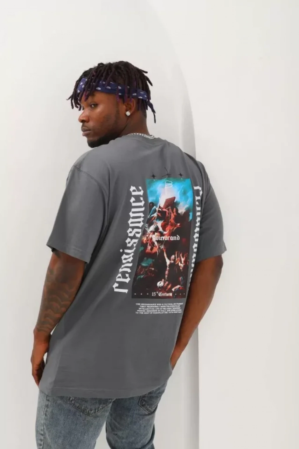 Unisex Oversize Baskılı Bisiklet Yaka T-Shirt - Füme