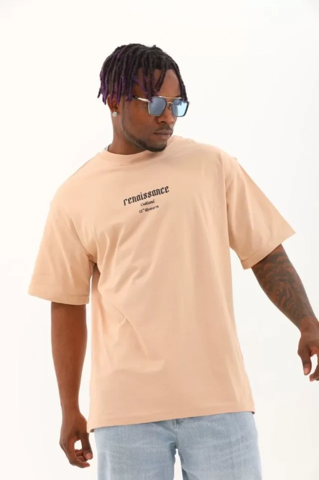 Unisex Oversize Baskılı Bisiklet Yaka T-Shirt - Bej