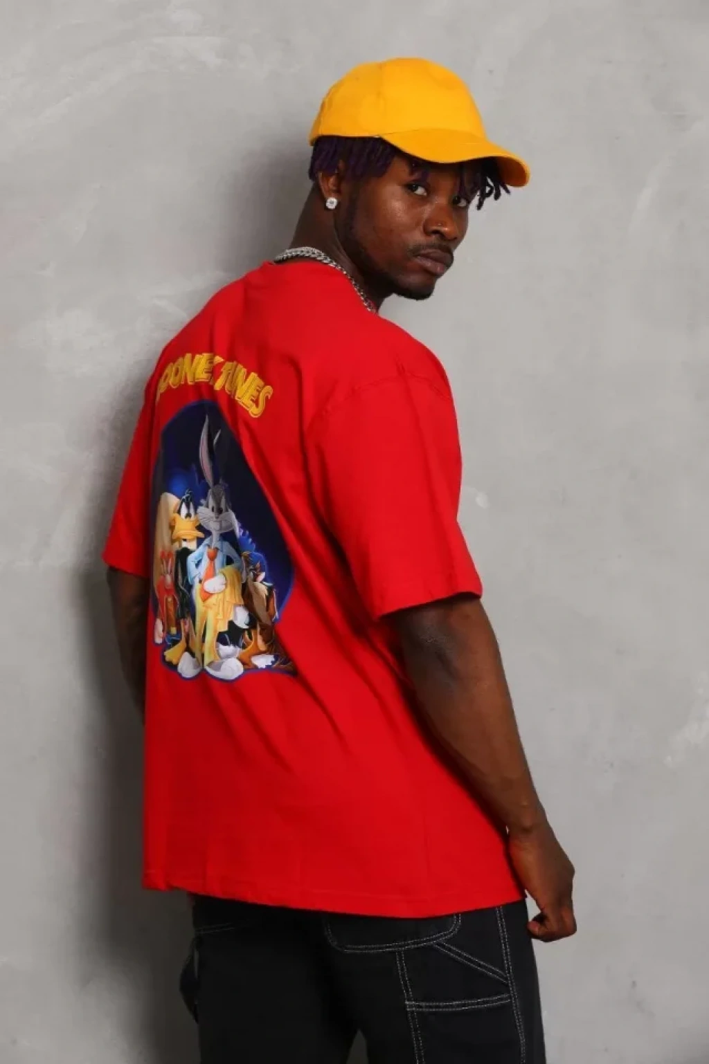 Unisex Oversize Baskılı Bisiklet Yaka T-Shirt - Kırmızı