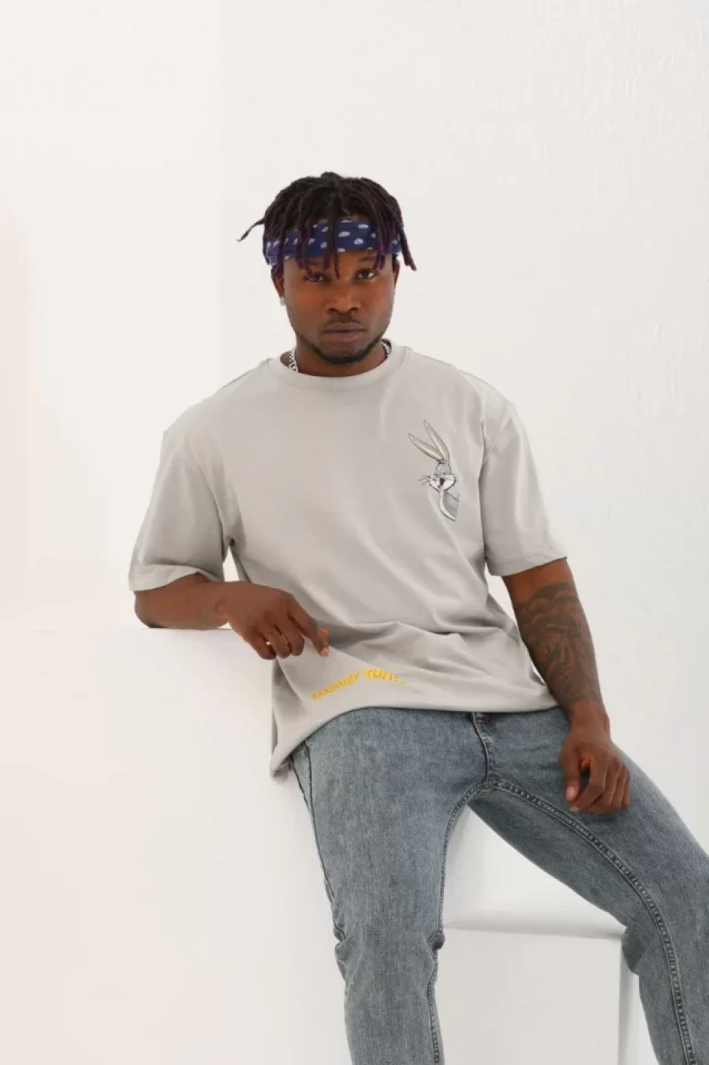 Unisex Oversize Baskılı Bisiklet Yaka T-Shirt - Gri